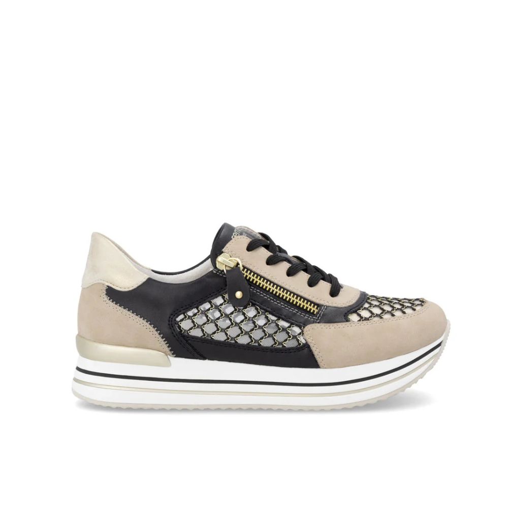 Élégantes, confortables et entièrement véganes ! Ces baskets basses Remonte noir et beige séduiront les femmes soucieuses de la mode grâce à leurs atouts. L'association astucieuse du laçage et de la fermeture éclair garantit un ajustement parfait et un maintien optimal. La semelle intérieure rembourrée et amovible ainsi que la semelle plateforme particulièrement légère et flexible sont des atouts supplémentaires. La doublure intérieure en microvelours respirant offre un confort longue durée. Impossible de faire plus confortable !