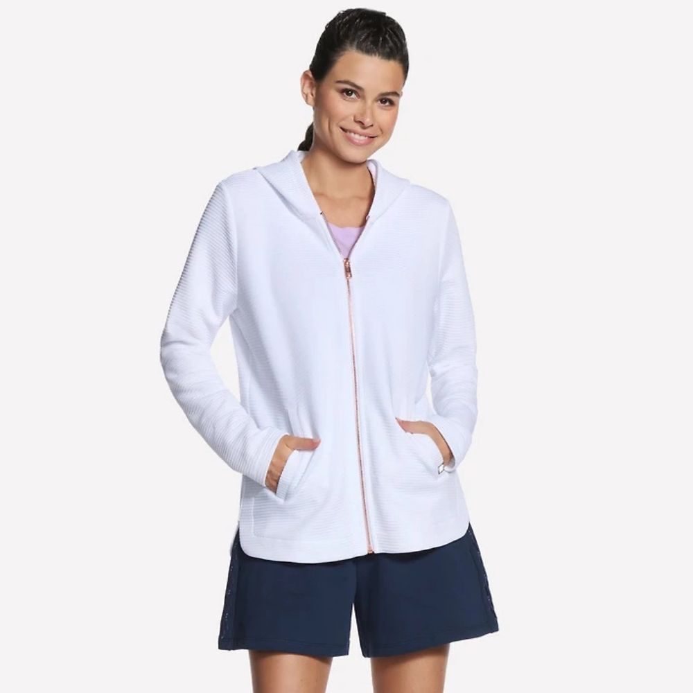 Le style au quotidien et le confort texturé se rencontrent dans la tunique-veste Skechers GO WALK™ Everywhere. Ce modèle zippé à manches longues est confectionné dans le tissu respirant côtelé Skechers Ottoman™ et est doté d’une capuche doublée, d’un ourlet asymétrique plus long à l’arrière ainsi que de poches passepoilées pour les mains.