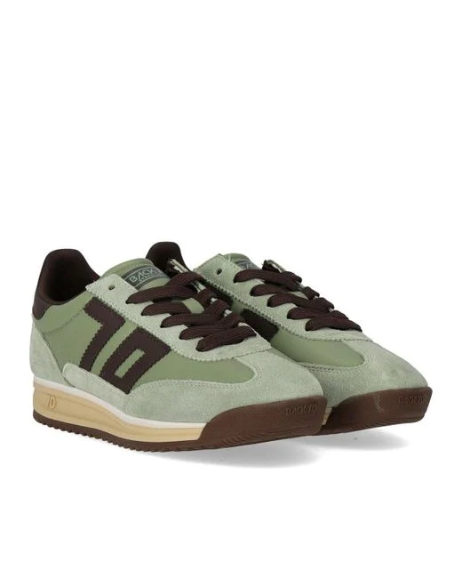 Baskets Back 70 en cuir souple dans les tons vert sauge et marron. Doublées en tissu technique et dotées d’une semelle intérieure amovible. Semelle en caoutchouc de 3 cm de hauteur. Couleur : vert