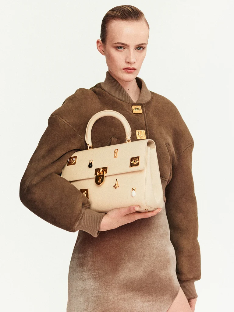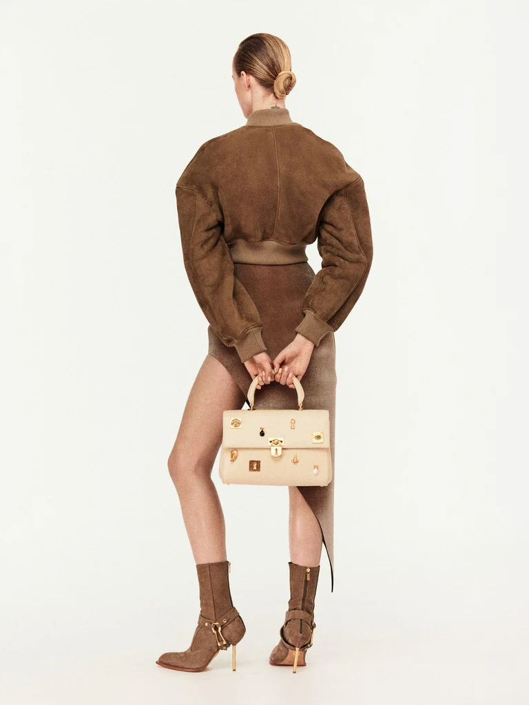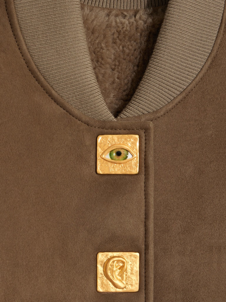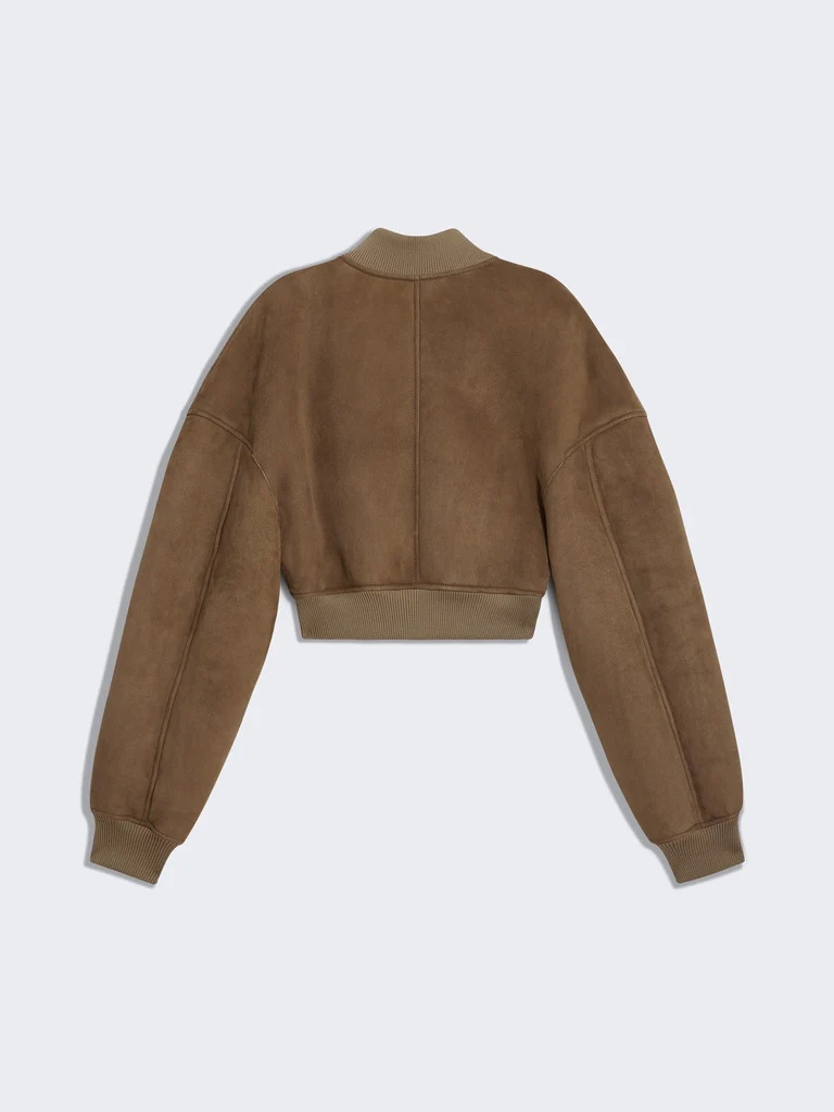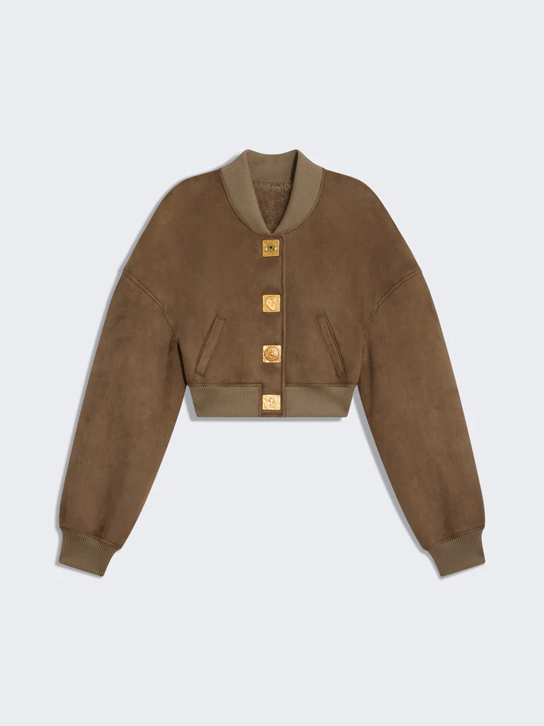 Ce bomber au volume court est confectionné en cuir d’agneau taupe et intérieur shearling. Il est rehaussé de bords cotes ton sur ton au col et en bas de manches et d’une patte de boutonnage décorée de boutons pression Anatomie signature en métal doré au milieu devant.