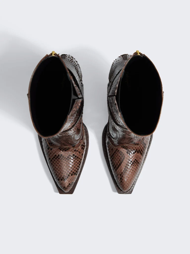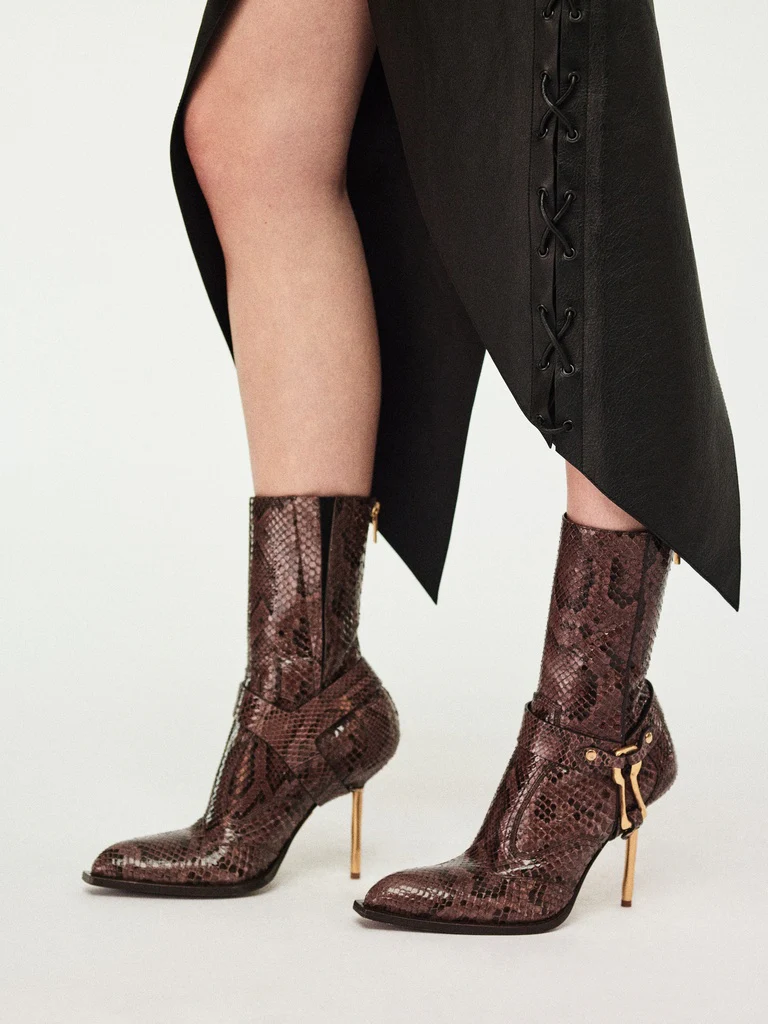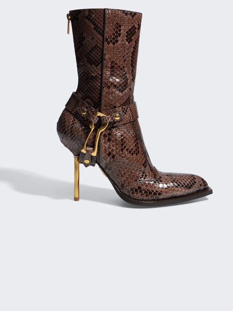 Cette paire de bottines d’inspiration western en python à talon aiguille orné d’un anneau à strass et d’une lanière amovible rehaussé du détail Trou de Serrure en métal doré rend hommage à l’un des codes emblématiques de la Maison.