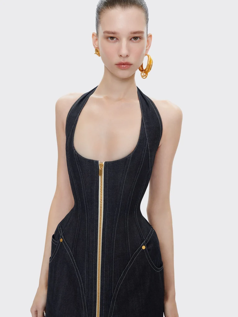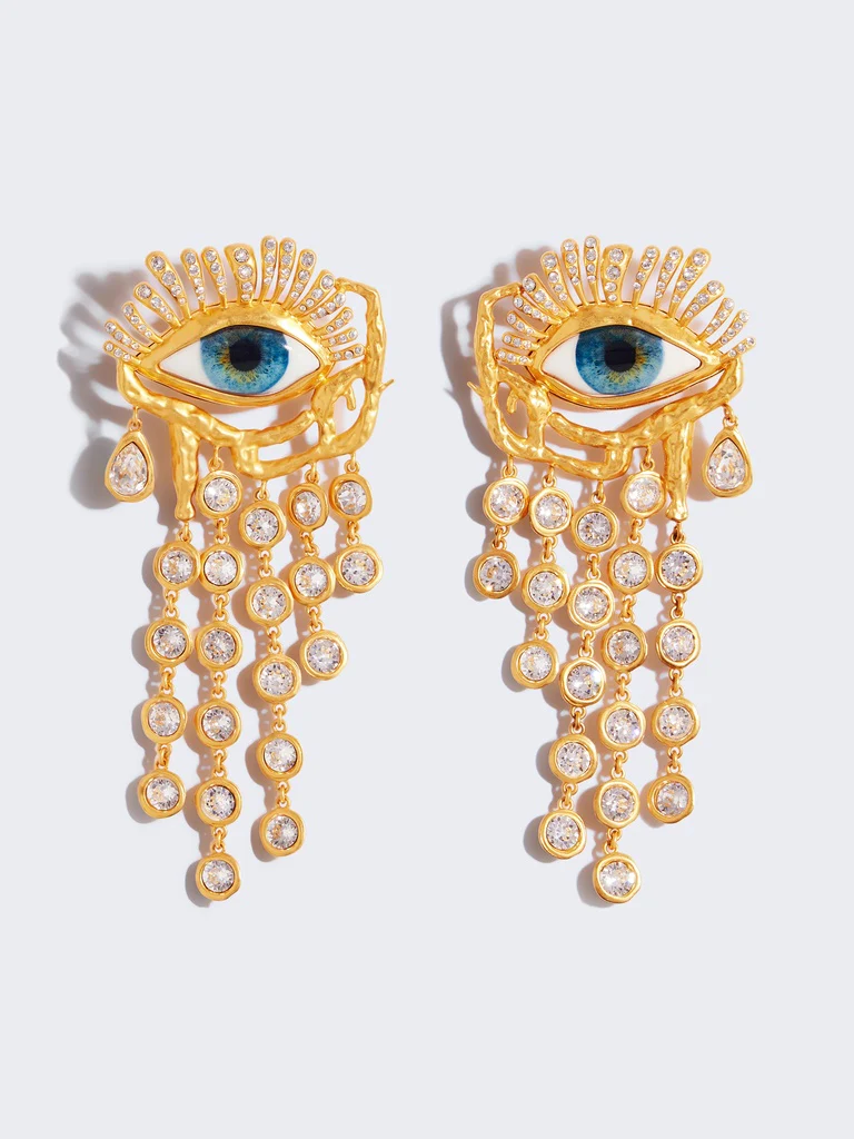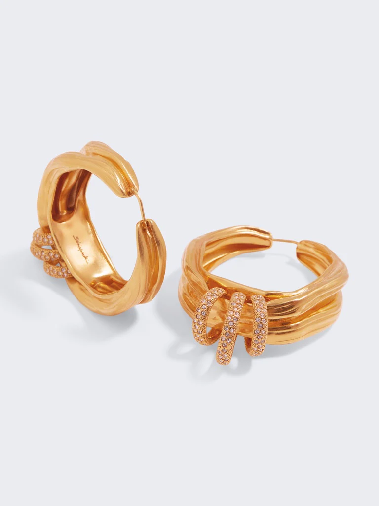 Ces boucles d’oreilles en forme de ruban en laiton doré texturé sont ornées d’un piercing à strass.