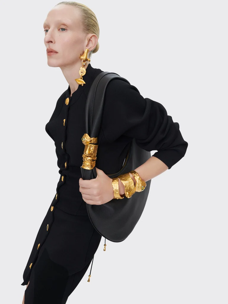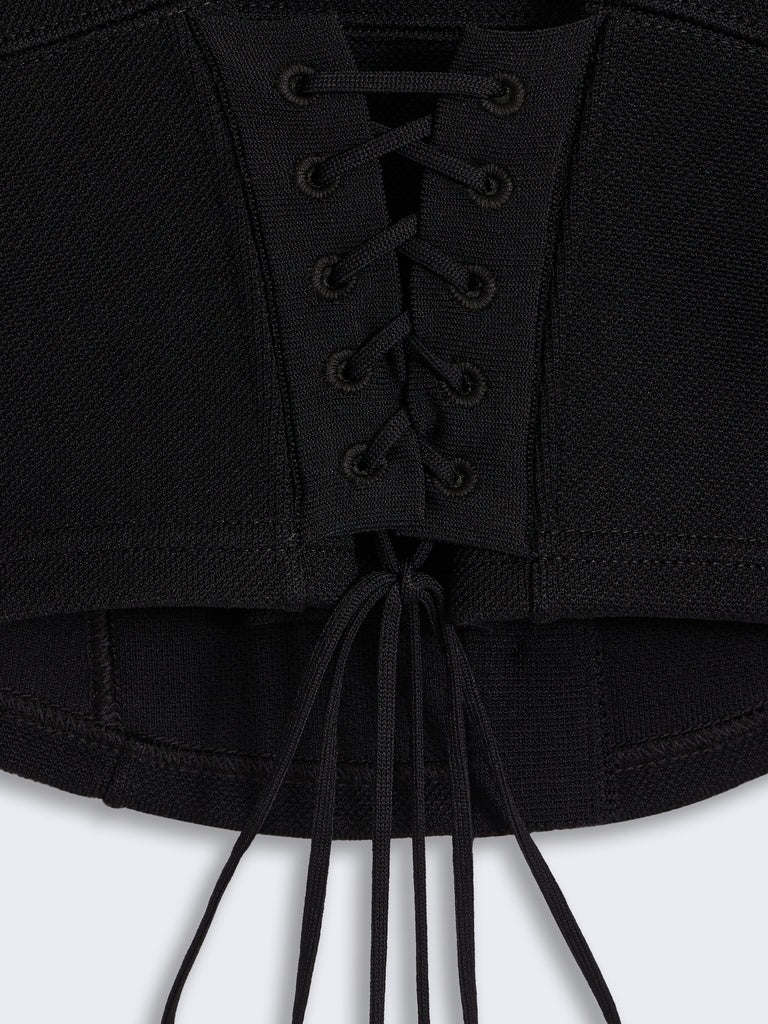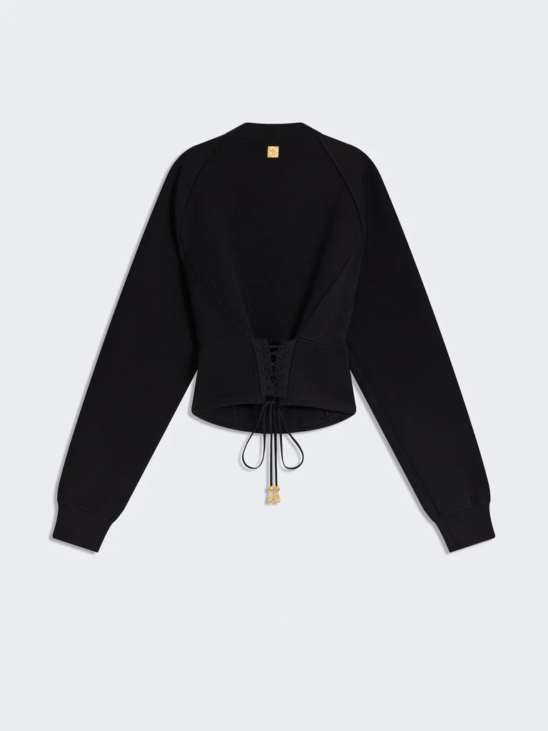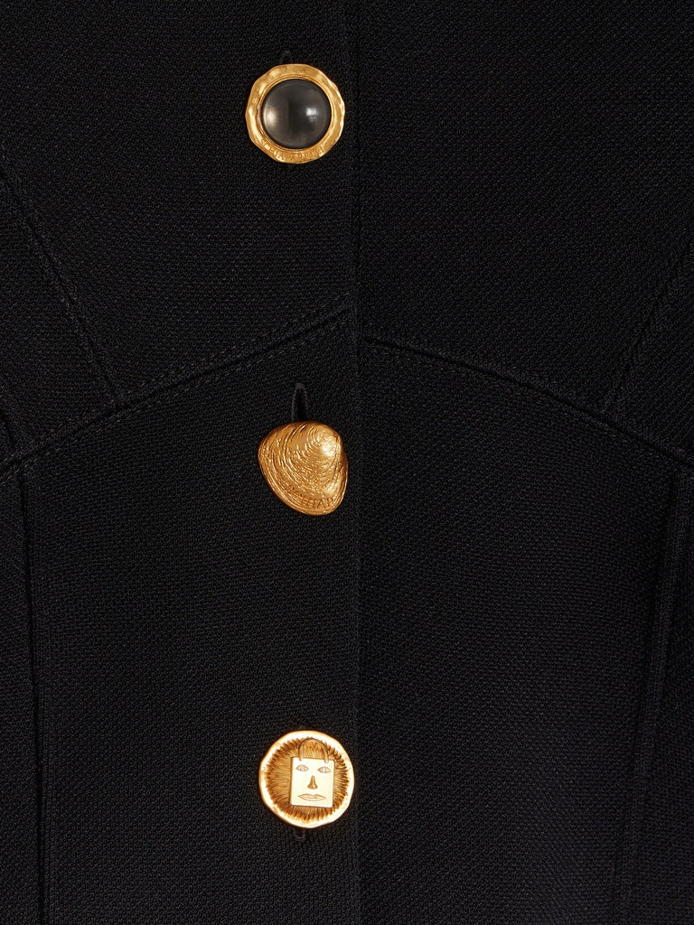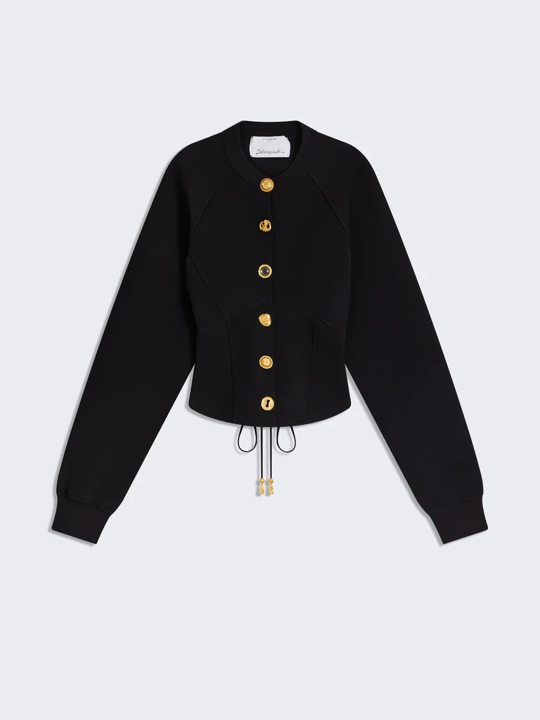 Ce veste cardigan en maille viscose piquée noire est lacée dans le dos pour créer ce volume bouffant. Elle est rehaussée de boutons bijoux en laiton doré martelé sur le devant.