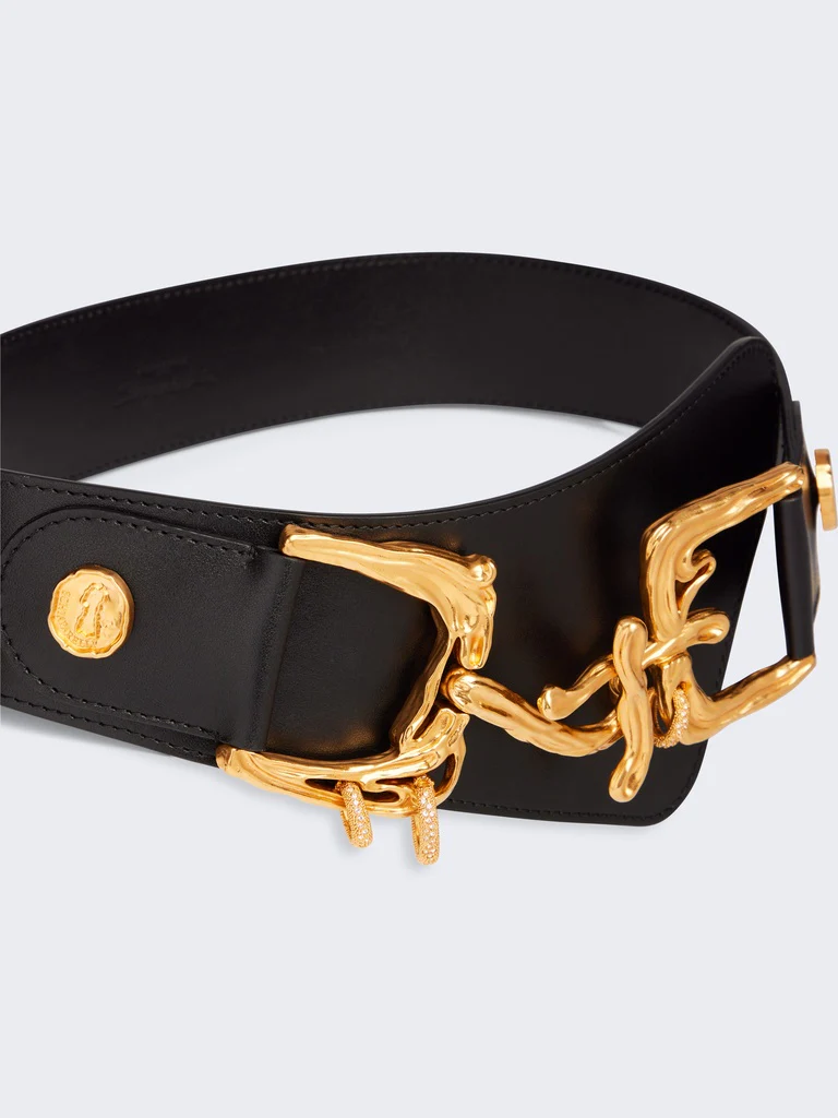 Cette ceinture en cuir s’inspire des codes de la culture cowboy revisités à la mode Schiaparelli.