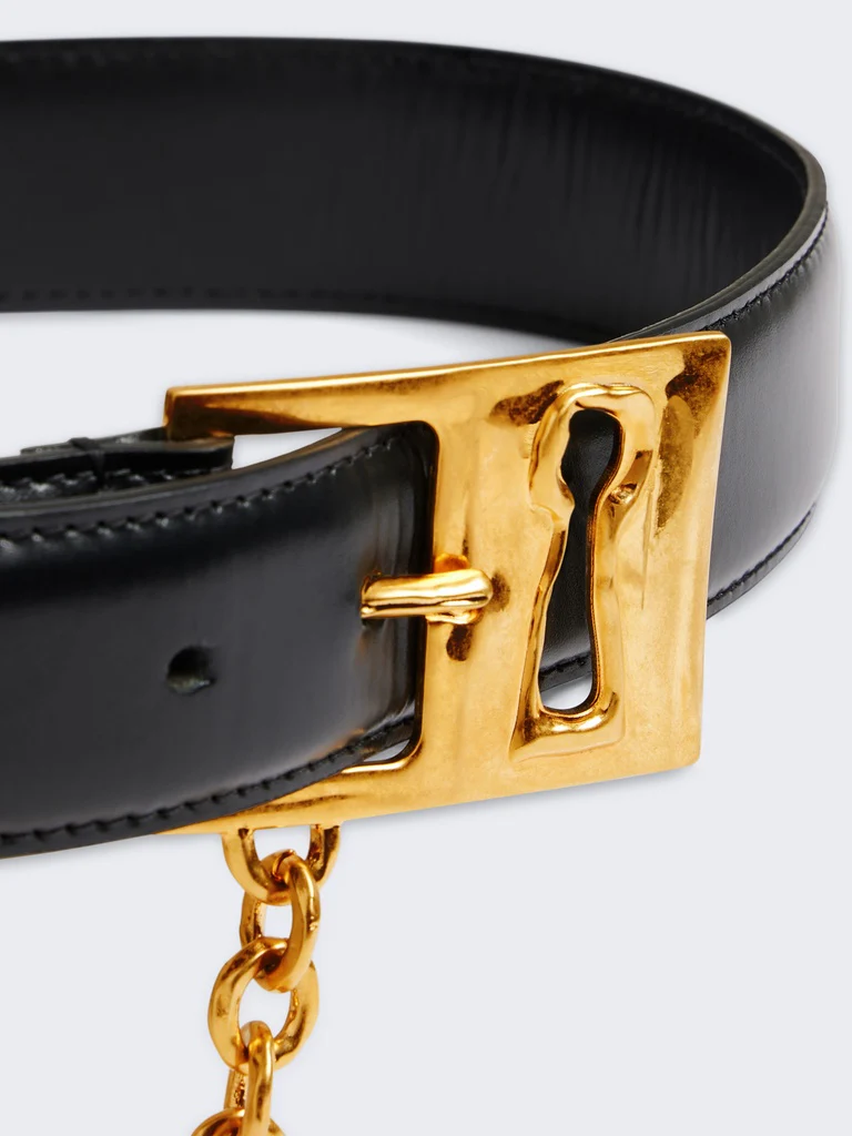 Cette ceinture en cuir de veau vernis noir est surmontée d’un fermoir en forme de Trou de serrure signature en laiton doré martelé réhaussé d’une chaîne à goussets en métal doré.
