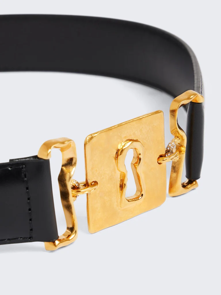 Cette ceinture en cuir d’agneau lisse noir est surmontée d’un fermoir en forme de Trou de serrure signature en laiton doré martelé.
