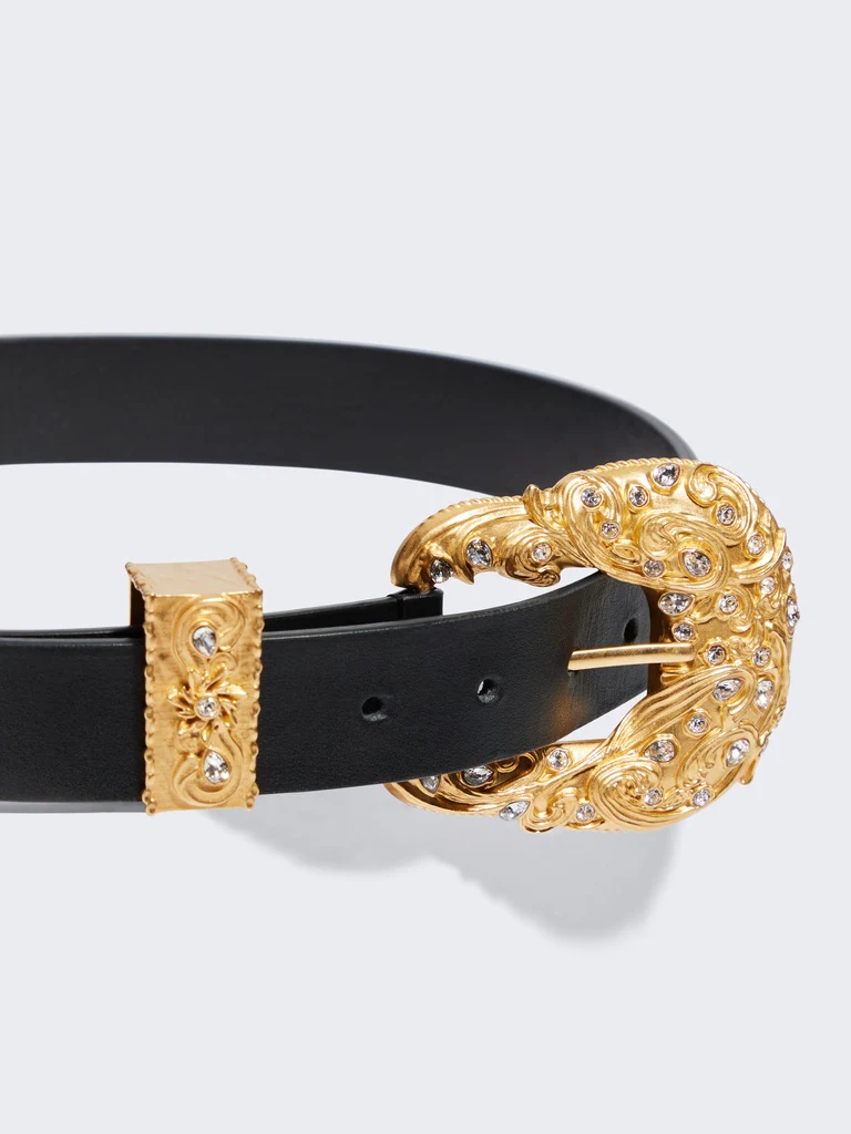 Cette ceinture en cuir noir rehaussée d’une boucle en métal doré ornée de strass.