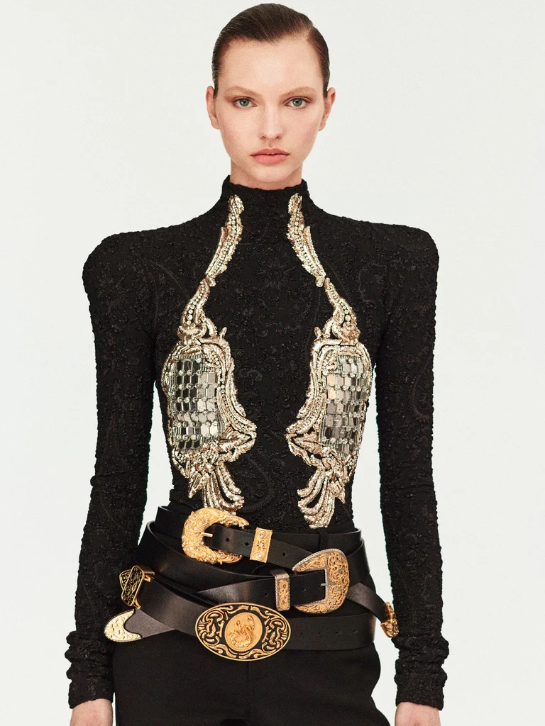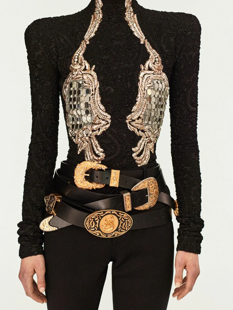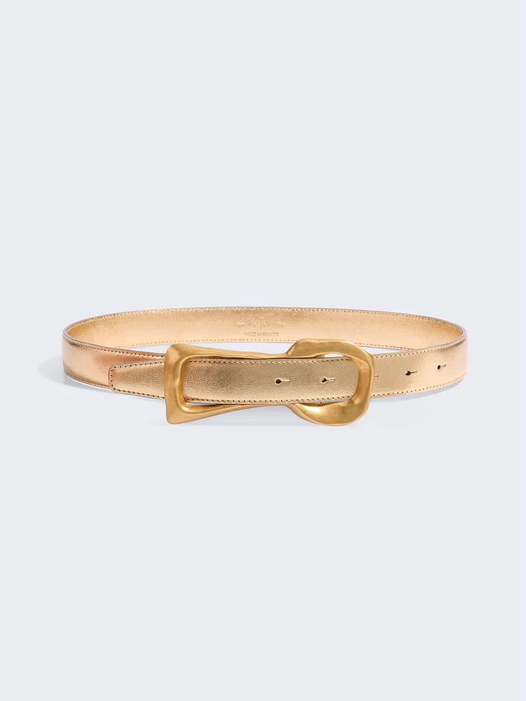 Cette ceinture en cuir noir rehaussée d’une boucle en métal doré et argenté.
