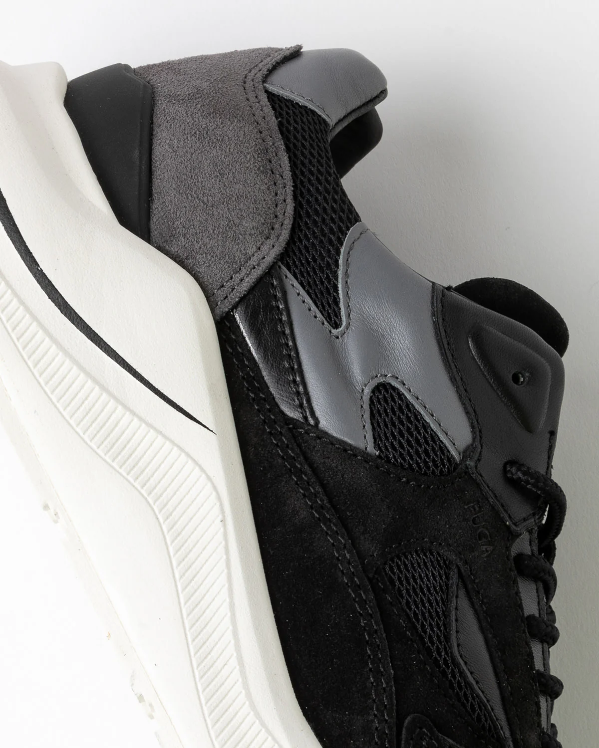 Logo carré brodé sur un patch arrière en daim gris poilu.