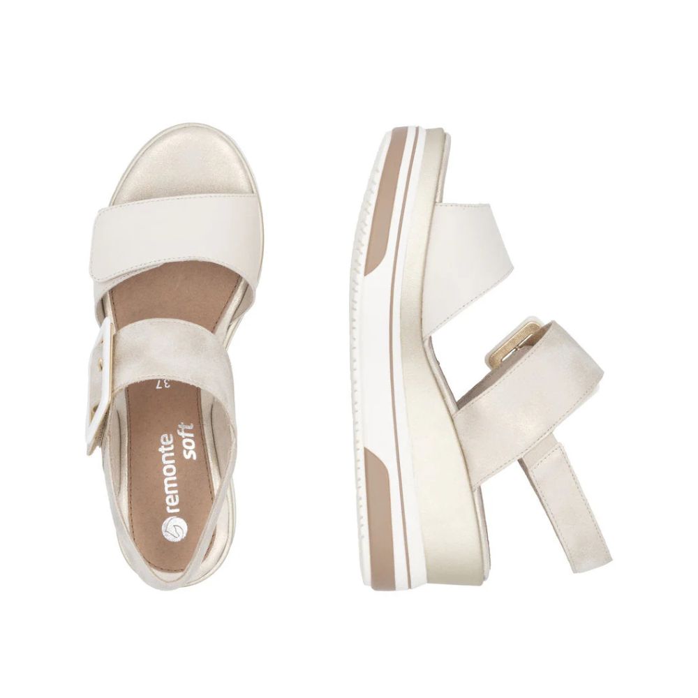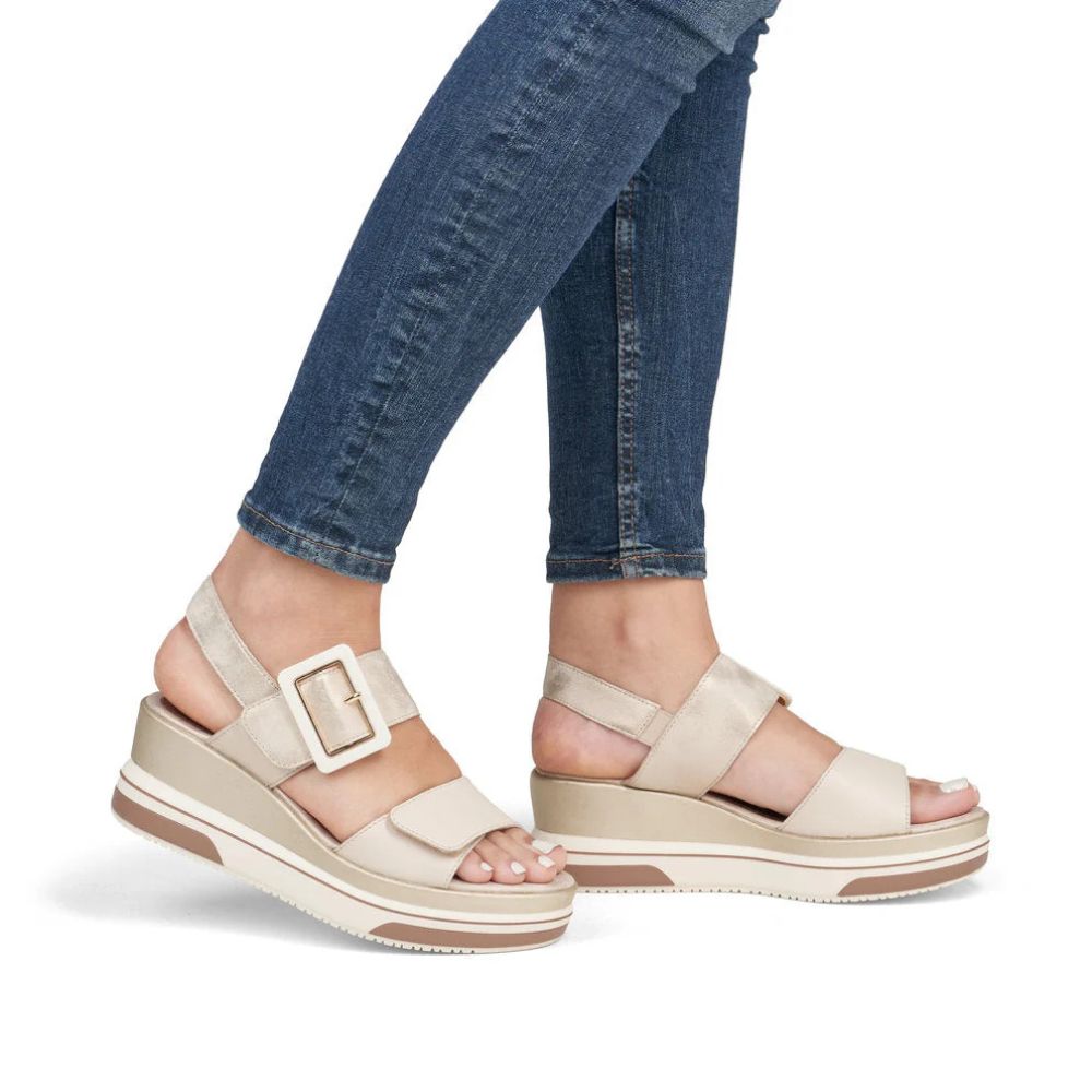 Style ET confort : il n'y a pas de « ou » ! Ces sandales compensées métallisées Remonte ont tout pour plaire. Les brides et la fermeture auto-agrippante assurent un maintien optimal. Leurs atouts fonctionnels sont parfaitement complétés par une semelle intérieure souple et une semelle légère et amortissante à talon compensé. Pour les femmes aux pieds larges, ces sandales sont également disponibles en grandes tailles. Impossible de faire plus confortable !