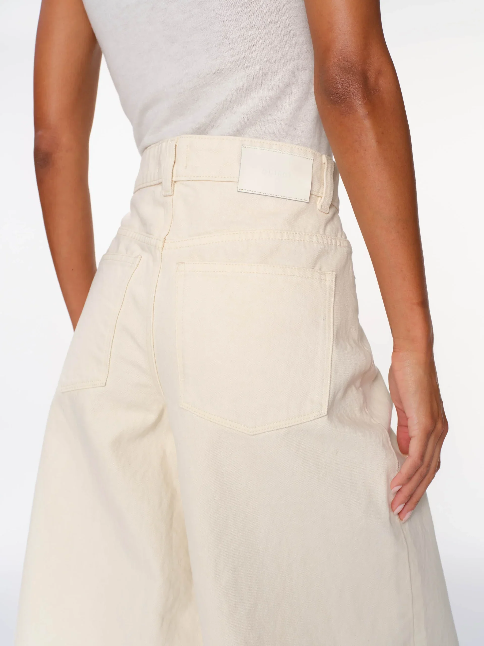 L’écru est un denim de couleur naturelle. Il est doté de ferrures argentées, de surpiqûres ton sur ton, d’un ourlet brut et d’un empiècement écru au dos.