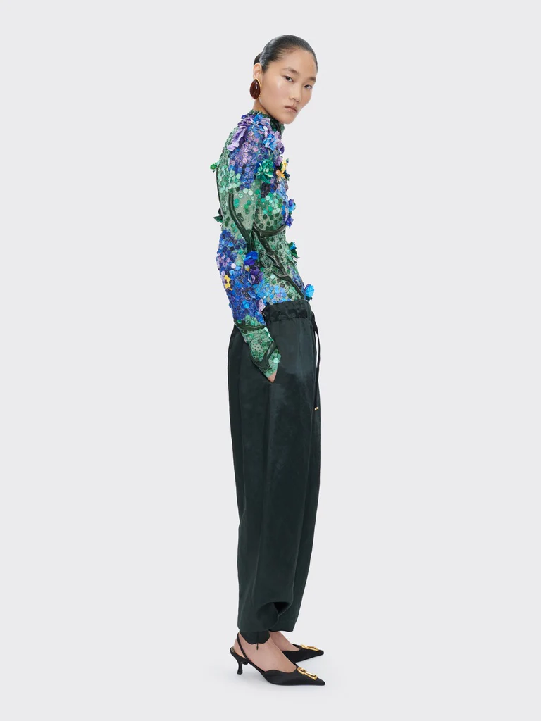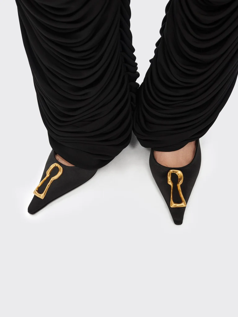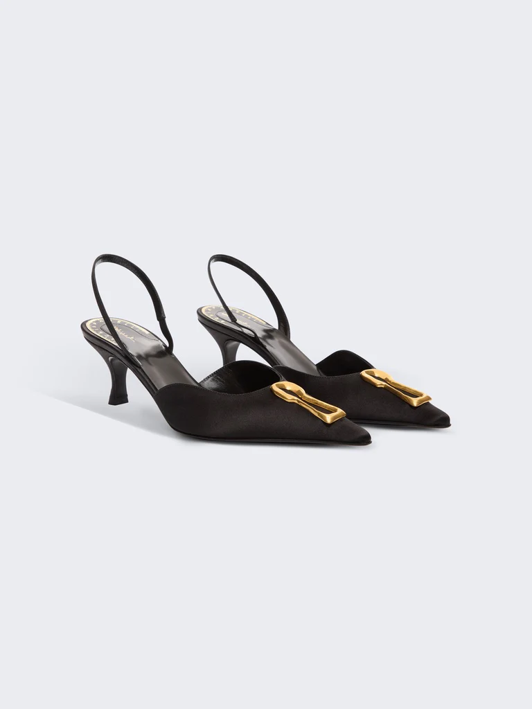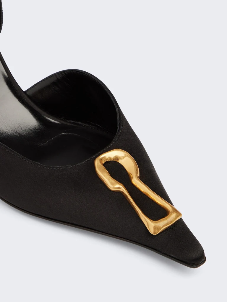 Ces mules à talons en satin noir sont inspirées de l’un des codes emblématiques de la Maison.