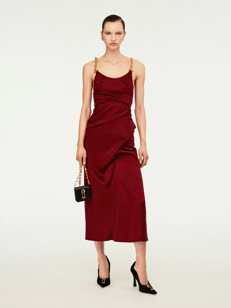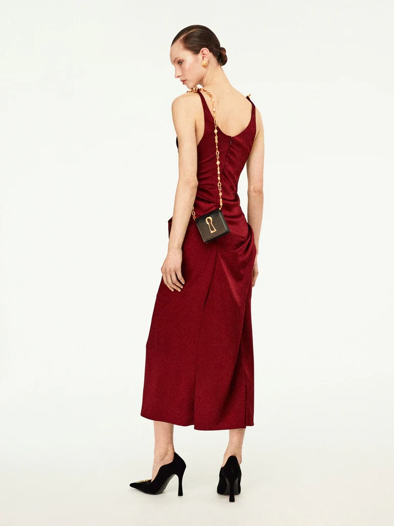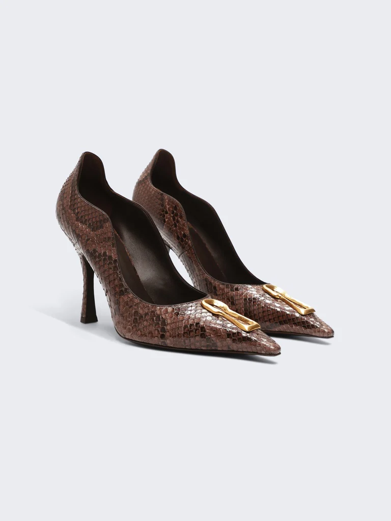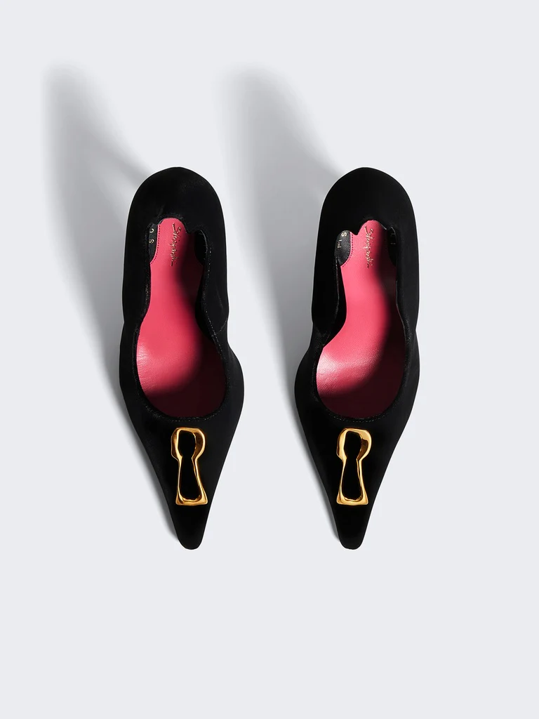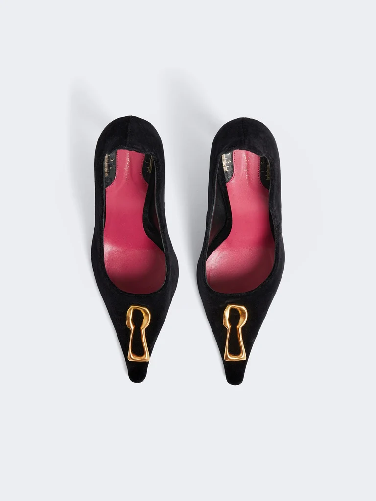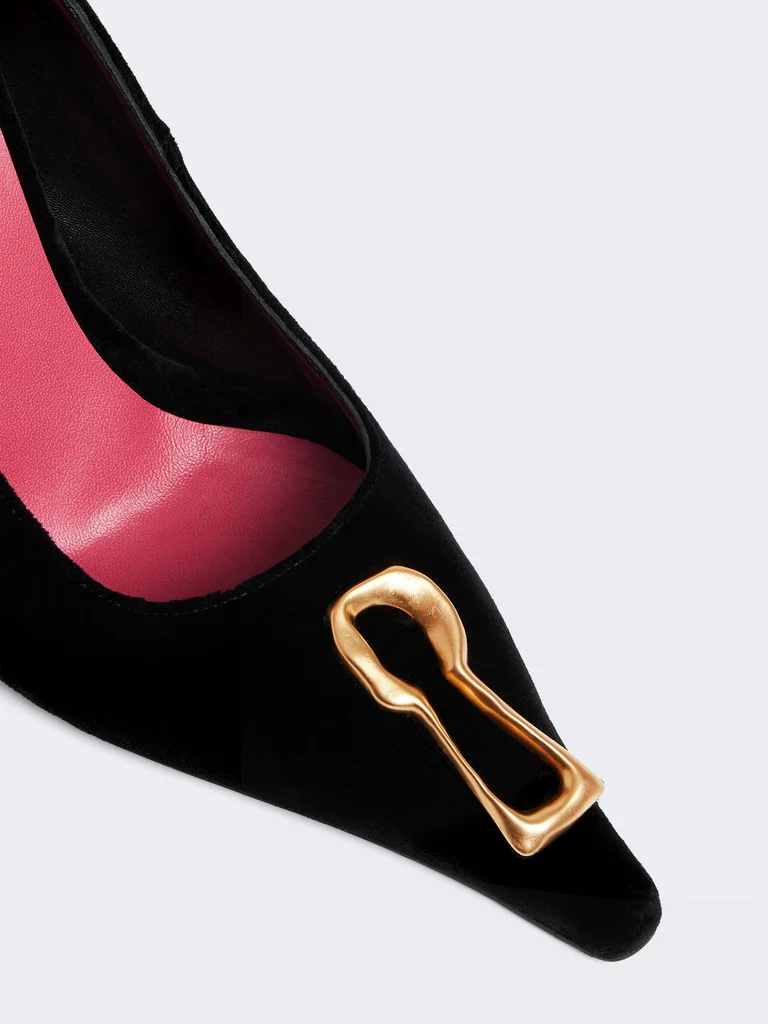 Cet escarpin pointu en velours noir et intérieur cuir est décoré du détail trou de serrure signature en métal doré, code emblématique de la Maison. Sa coupe décolletée sur les côtés du pied et son talon de 105mm mettent en valeur le galbe de la jambe.