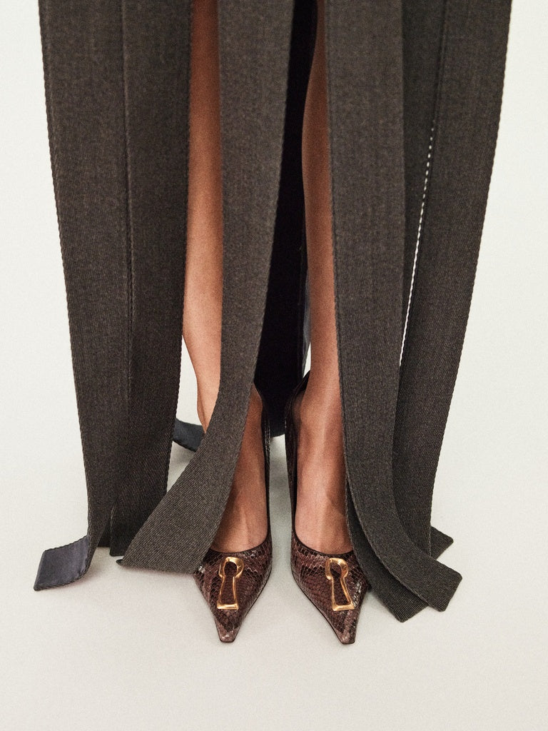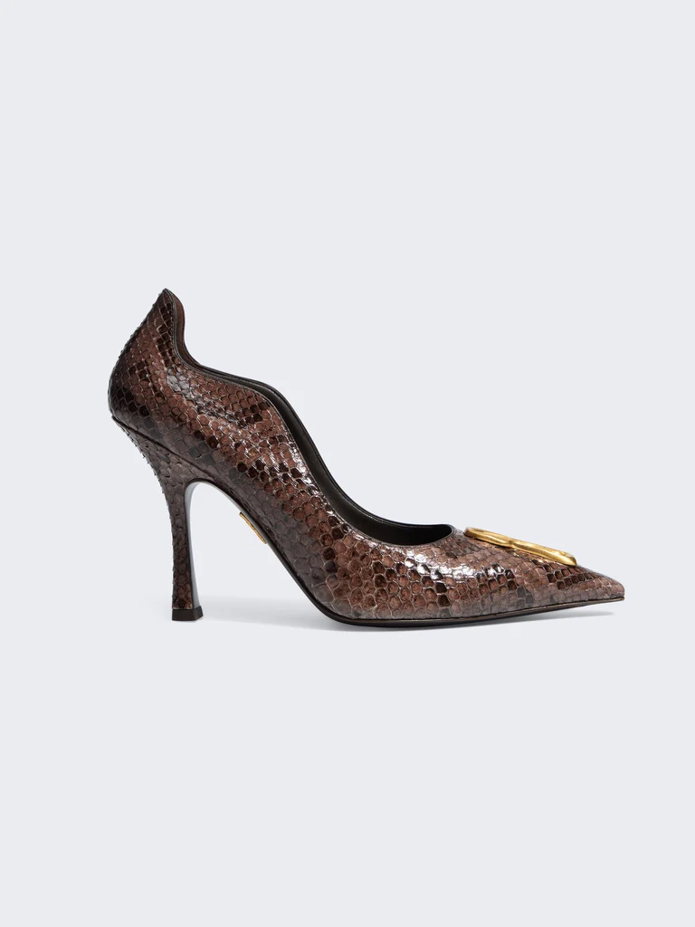 Cette paire d’escarpins en python à l’empeigne ondulée rehaussée du détail Trou de Serrure signature en métal doré rend hommage à l’un des codes emblématiques de la Maison.