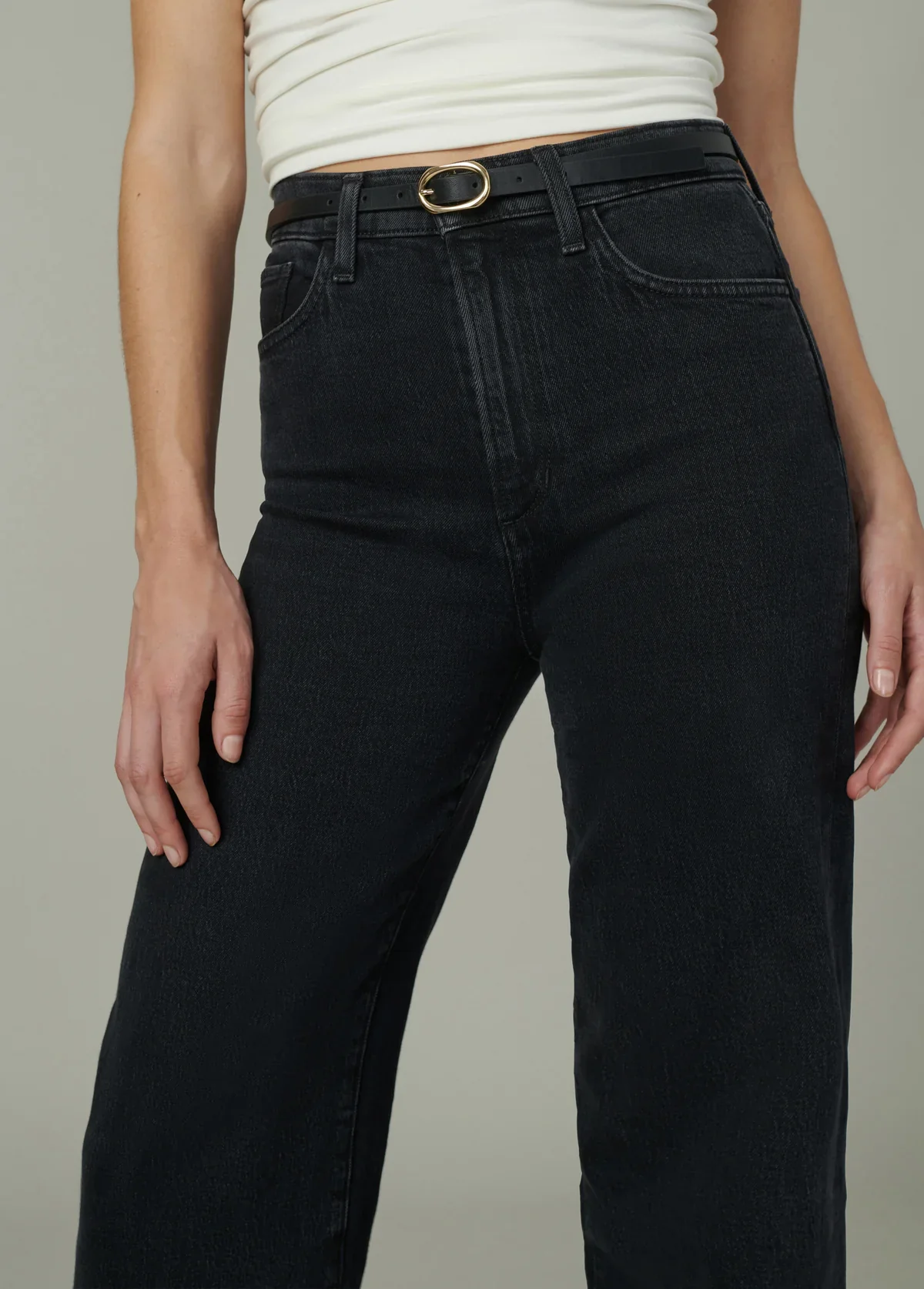 Coupe ajustée à la taille et aux hanches, taille haute et jambes larges sur toute la longueur.