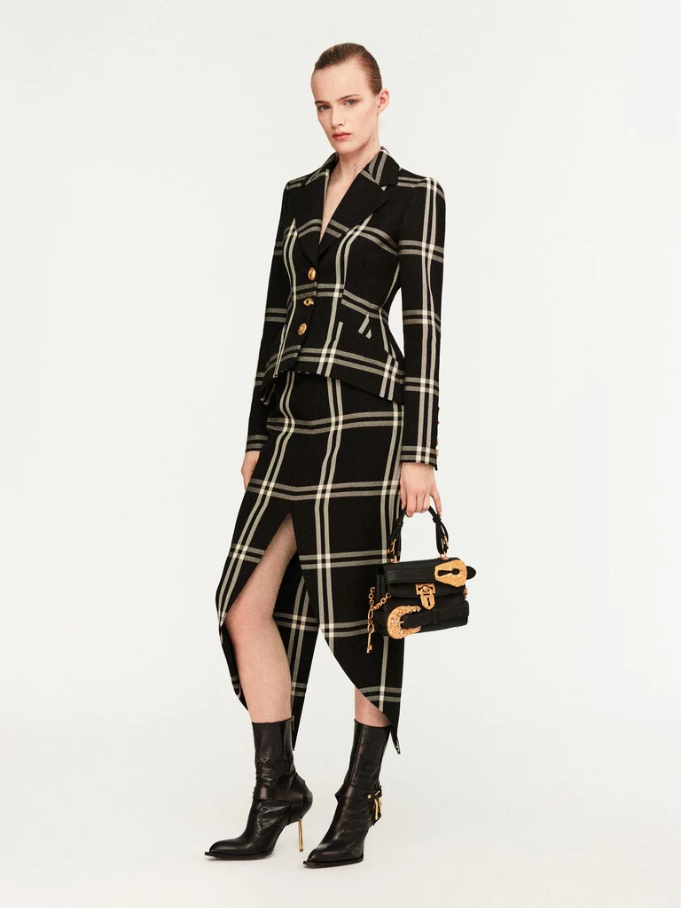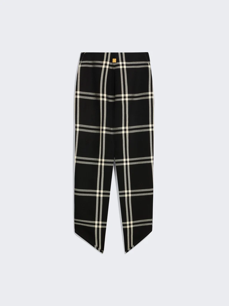 Cette jupe crayon en sergé de laine noir à carreaux écrus est rehaussée d’un ourlet ajouré et arrondi. Elle est ornée d’une fente au milieu dos, d’un rivet Trou de Serrure en métal doré et d’un zip invisible au côté gauche.