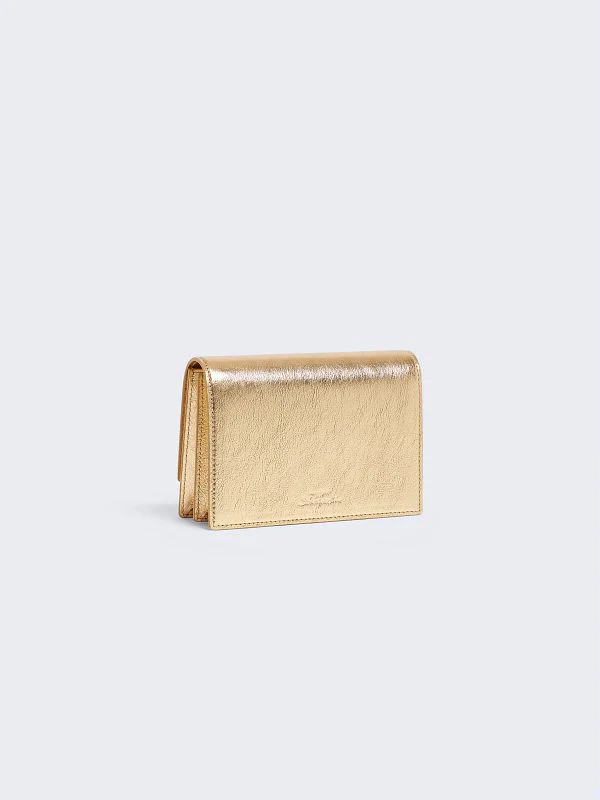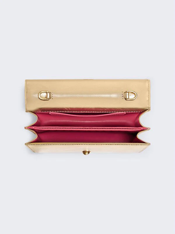 Sa construction à double soufflet se replie sur le devant à l’aide d’un rabat aimanté à bijou Nez doré serti d’un piercing en métal argenté contrasté.