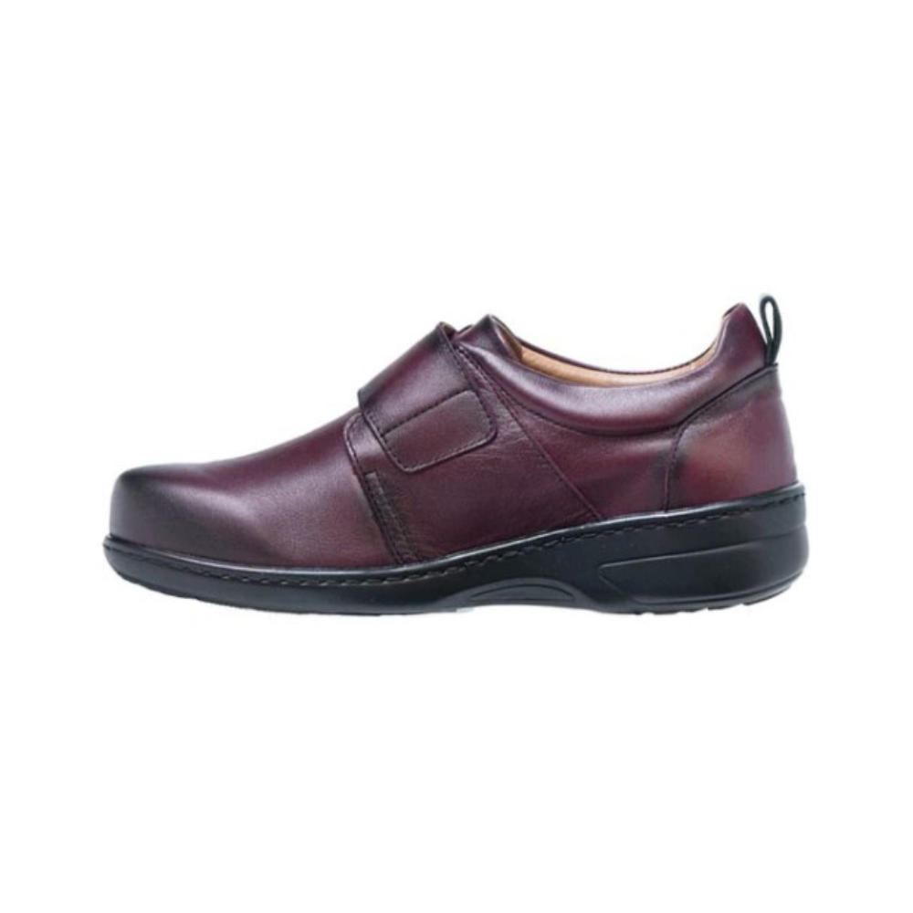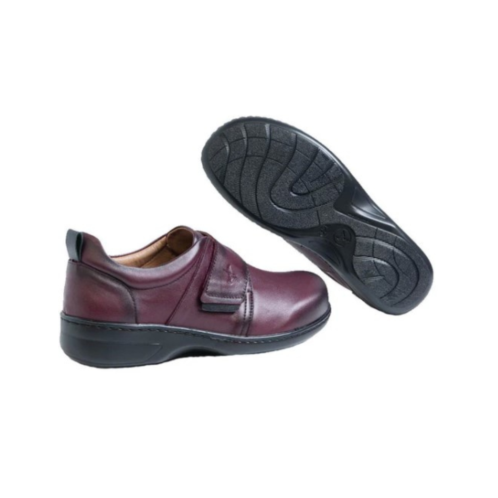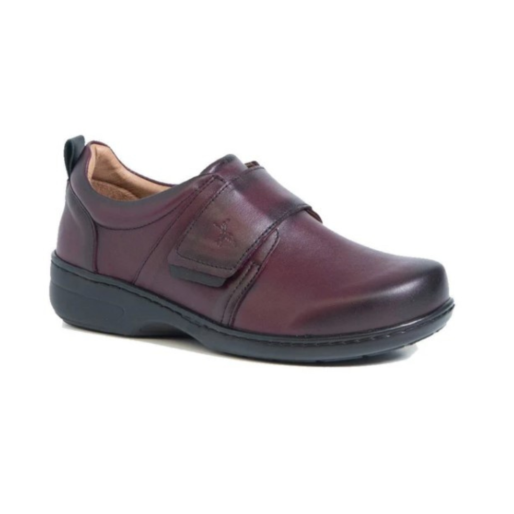 Ce soulier rouge vin est doté d'une tige composée de cuir. La tige présente de jolies nuances plus foncées le long des coutures et au niveau des orteils. La sangle auto-agrippante permet d'enfiler et d'ajuster la chaussure facilement. La semelle extérieure est en polyuréthane. Le talon a une hauteur d'environ 3 centimètres.
