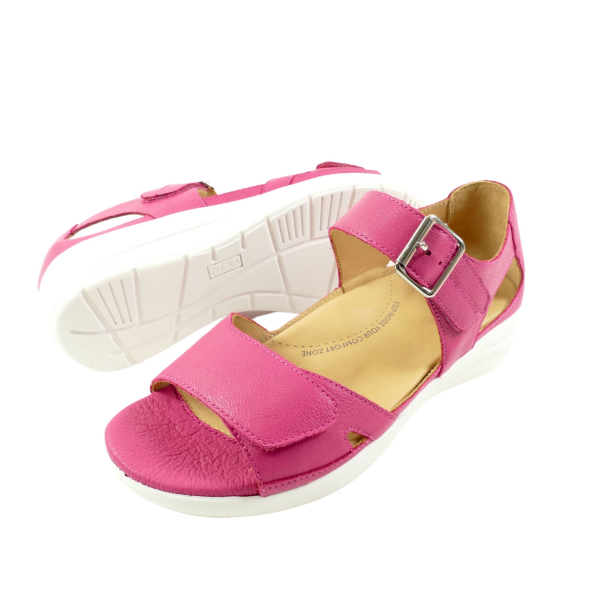 La sandale orthopédique Ziera Nenzory est fait de cuir. Ses velcros permettent de bien l’ajuster au pied. Son talon compensé vous élèvera toute en restant stable. Sa semelle intérieure est amovible et sa semelle extérieure est antidérapante. Disponible dans la largeur extra large pour les pieds plus fort.