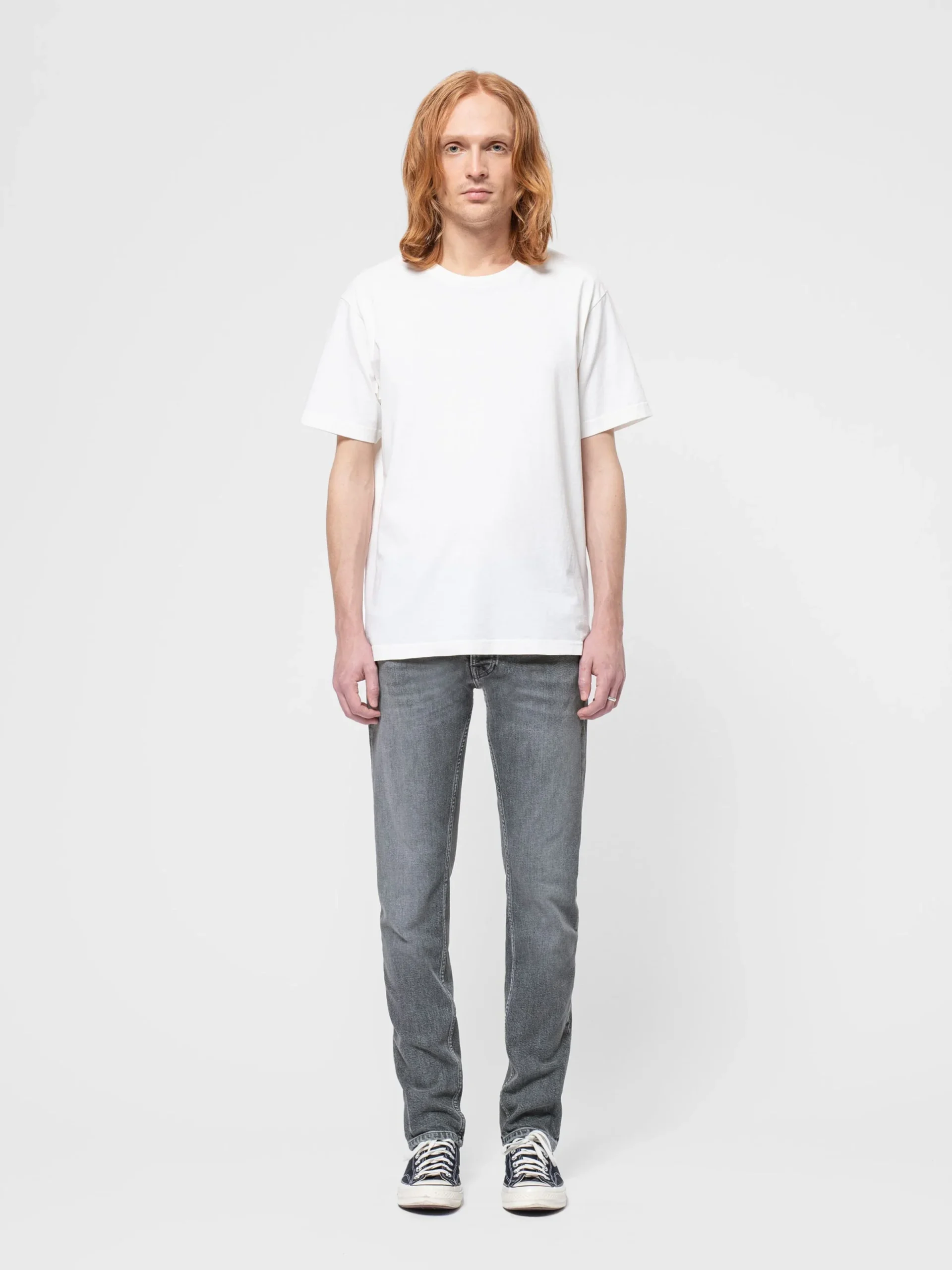 Jean slim à jambe droite dans un délavage gris clair raffiné, avec un aspect usé subtil et une nuance de gris parfaite. Habilement confectionné en denim extensible, ce jean présente une texture impressionnante et des détails soignés. Le doux aspect usé, complété par des reflets lumineux, contribue à la richesse du monochrome qui le distingue.