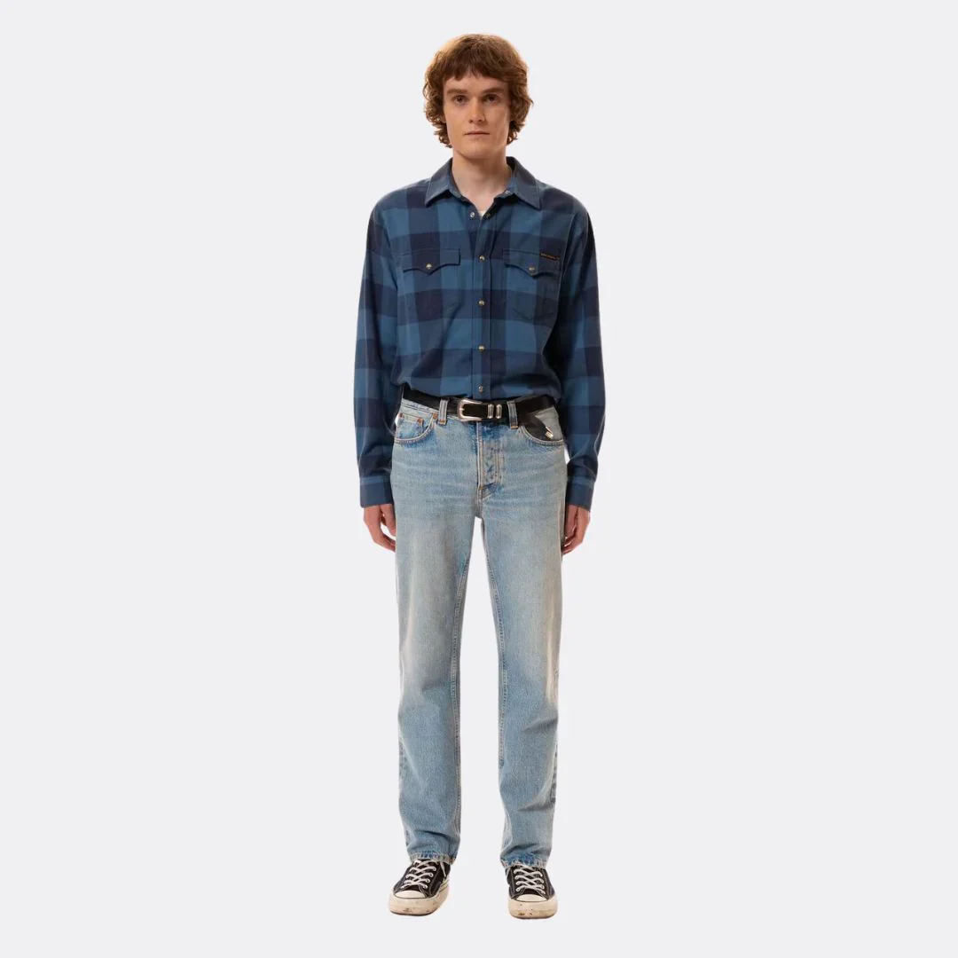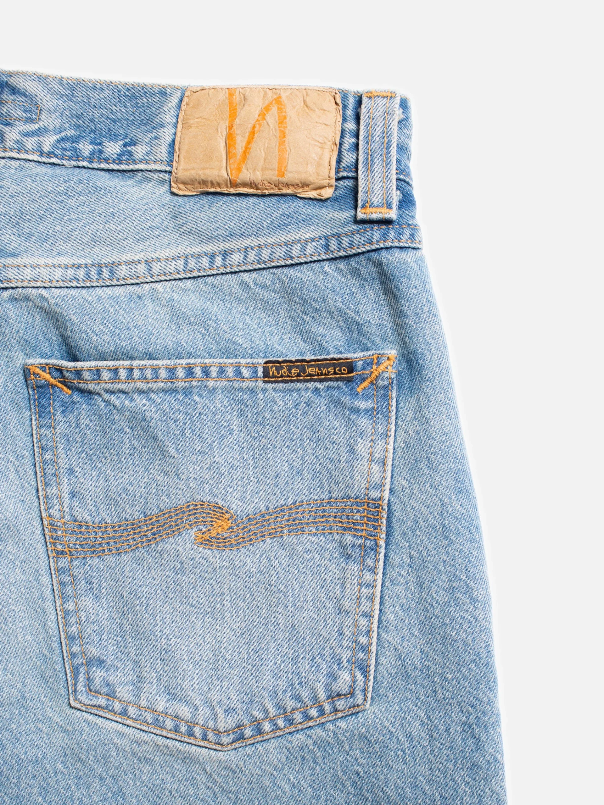 Coupe régulière avec jambe droite et taille haute. Ce délavage complète parfaitement la coupe. La texture marbrée des années 90, plus foncée, contraste avec les zones plus plates et usées. Les tons chauds donnent à ce vêtement une expression vintage authentique et vieillie.