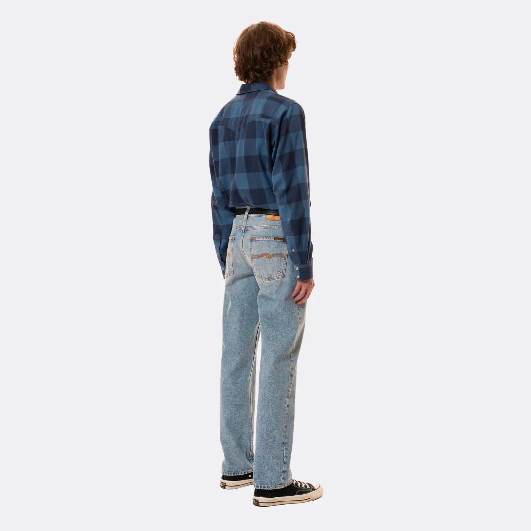 Coupe régulière à taille haute et jambe droite dans un délavage bleu moyen d’inspiration vintage. Fabriqué en coton biologique.