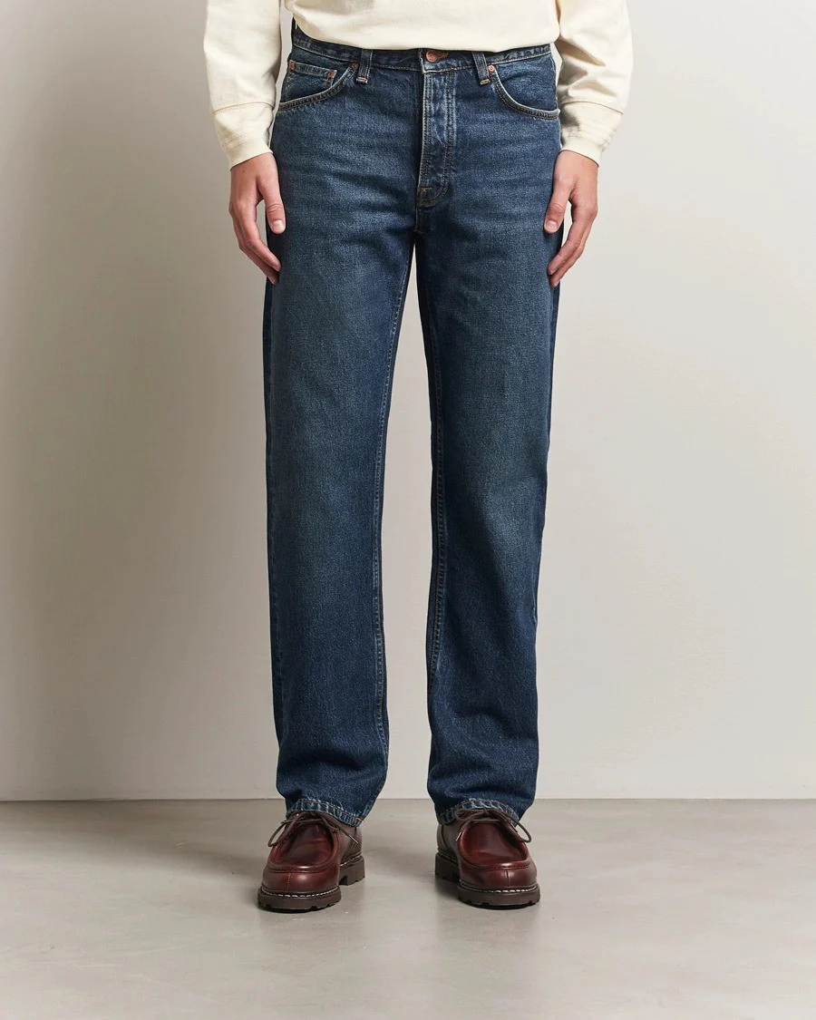 Jean taille haute à coupe droite, délavé bleu foncé avec de subtiles traces d’usure. Bien que sombre, ce jean a tout pour plaire. Il présente une gamme impressionnante de nuances indigo, du plus foncé au bleu vif atténué. Les zones abrasées ajoutent de la douceur, tandis que les zones non abrasées ajoutent une texture marbrée rugueuse.