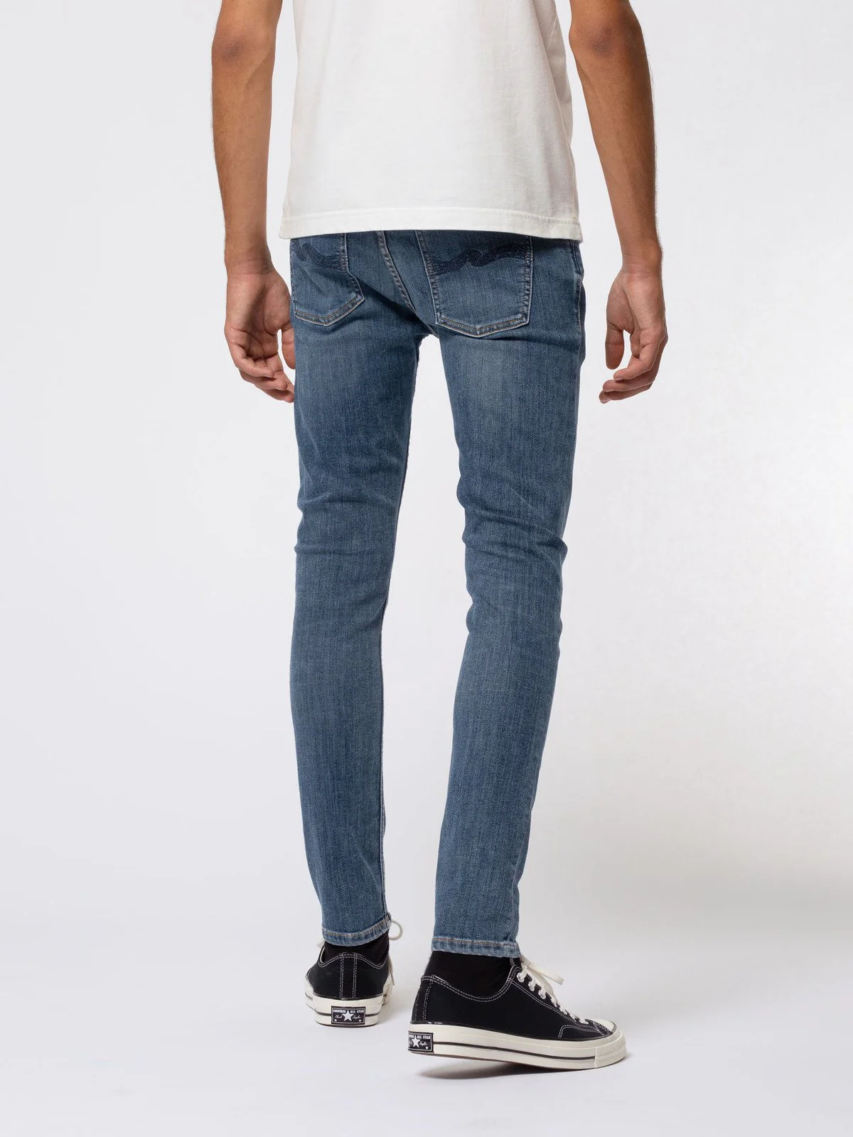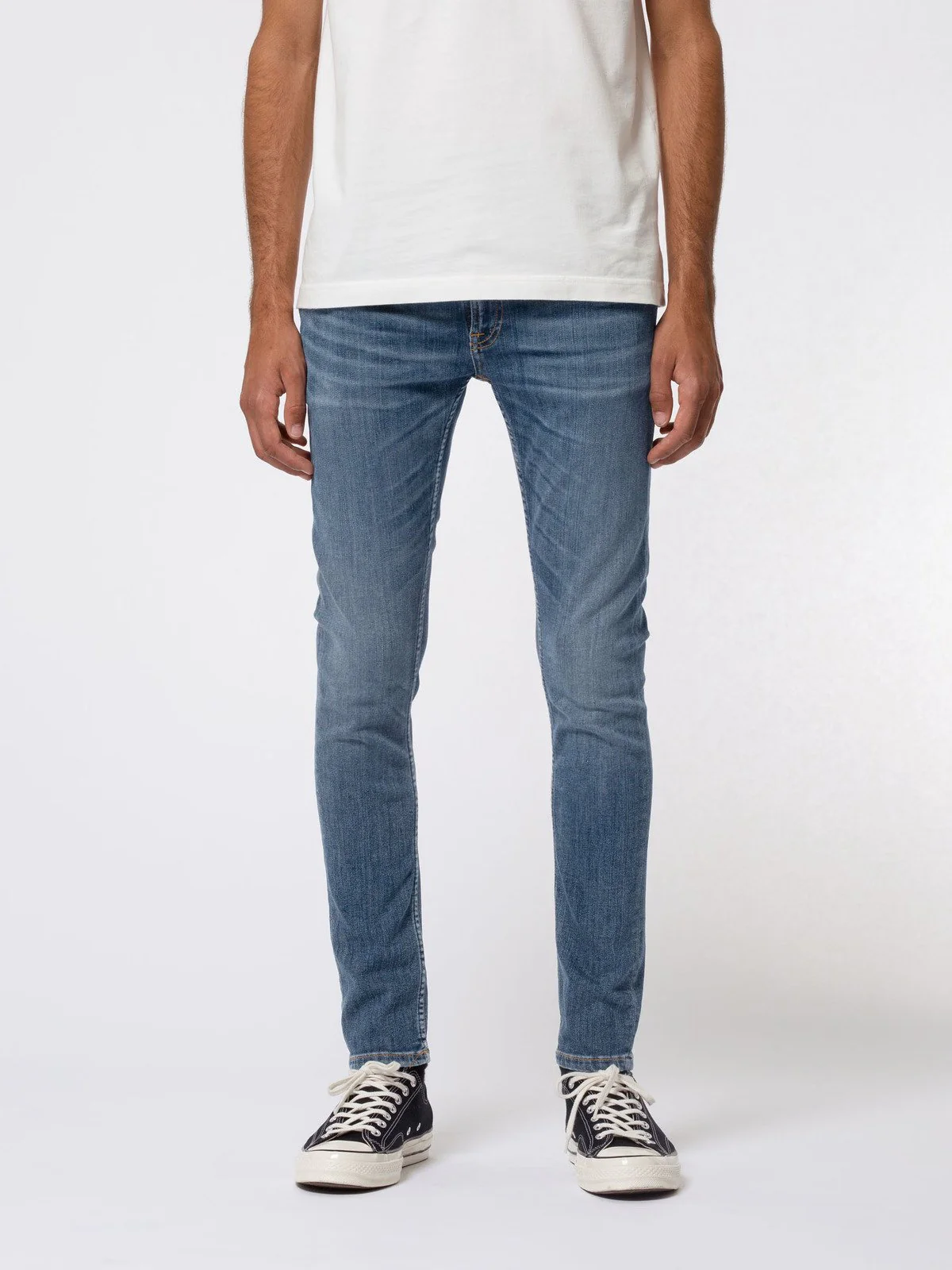 Jeans fabriqué en denim super stretch de 12,5 oz qui a été lavé dans une nuance de bleu moyen indigo. Les moustaches plus vives et le fil orange contrastent magnifiquement avec le ton de base, tandis que la broderie de la poche arrière de couleur marine ajoute un niveau de simplicité. Un Lin Skinny propre mais authentique dans un tissu denim confortable sans effort.