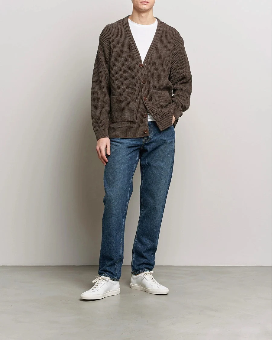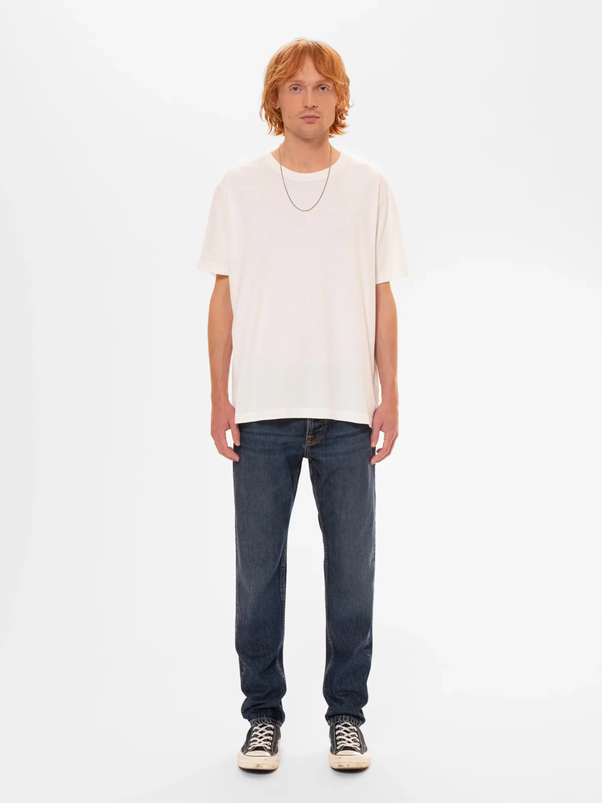 Jean de coupe régulière à jambe fuselée, délavé en bleu foncé et subtilement usé. Fabriqué en coton biologique.