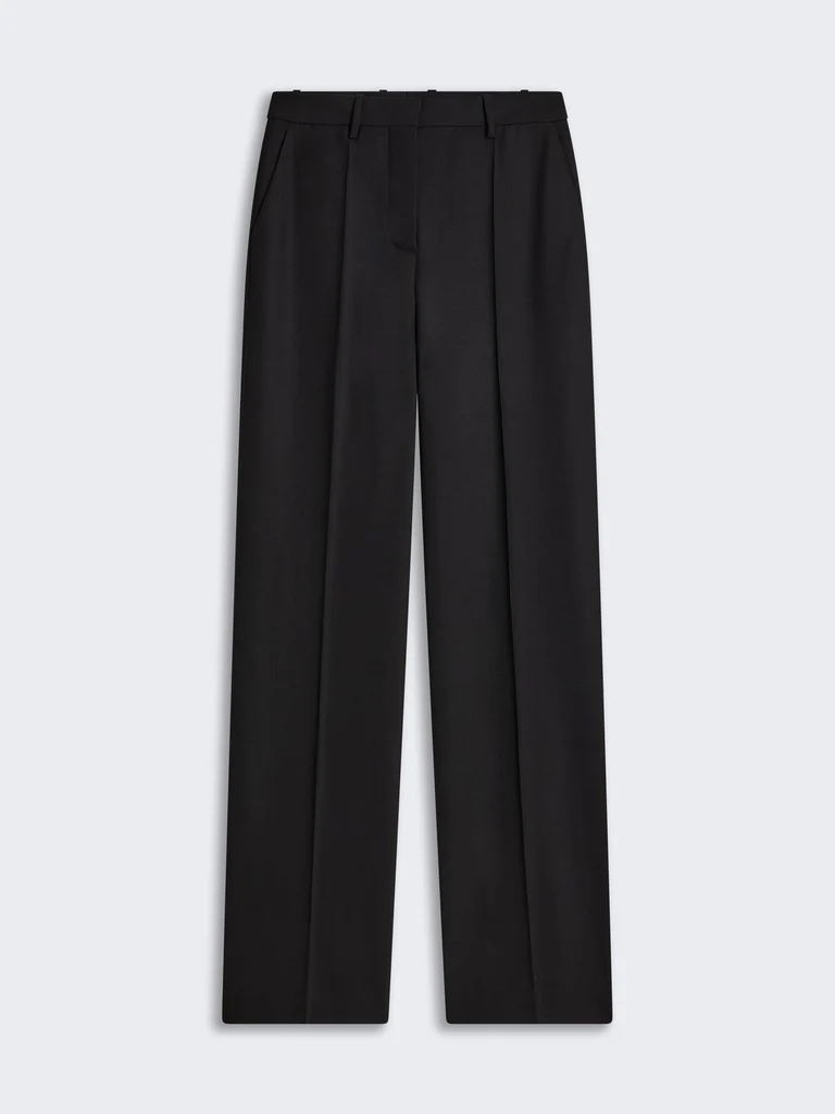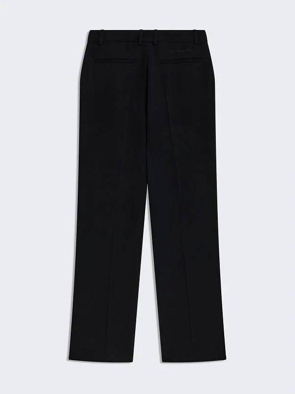 Inspiré des coupes masculines, ce pantalon droit dispose d’un pli sur le devant et de poches arrière à simple passepoil.