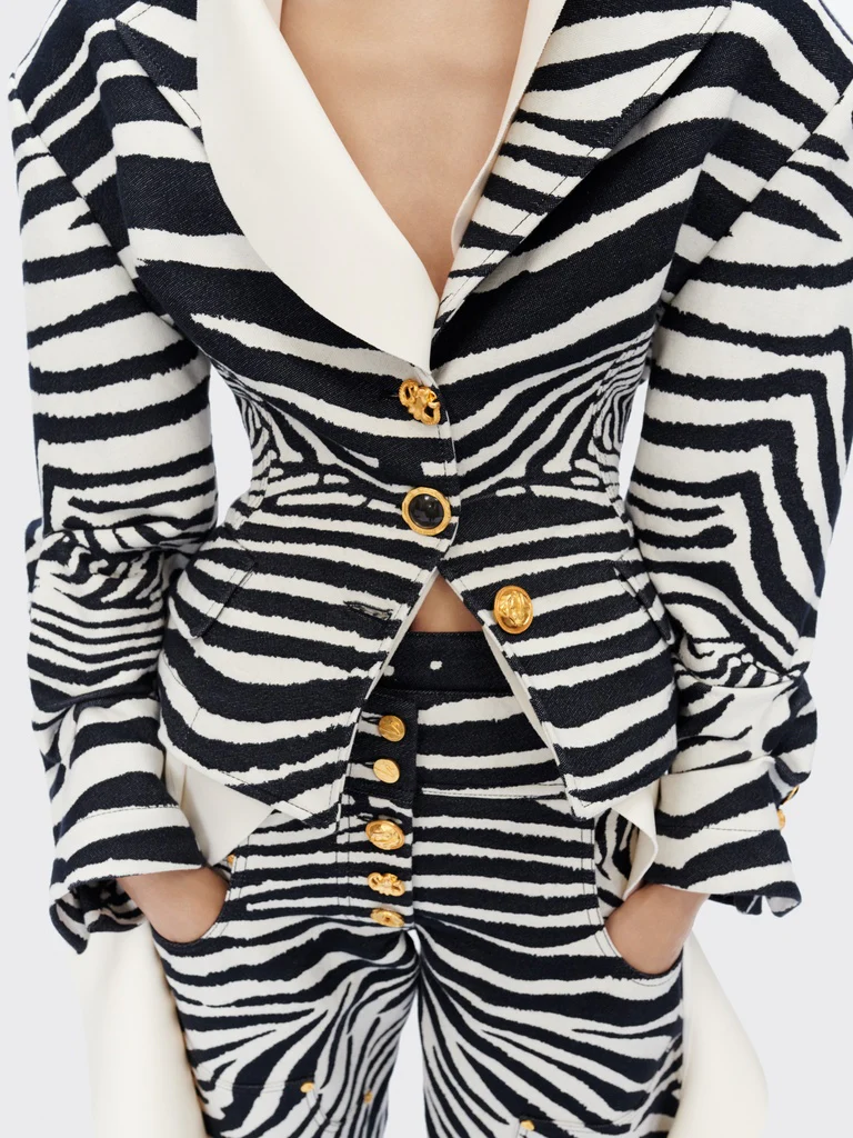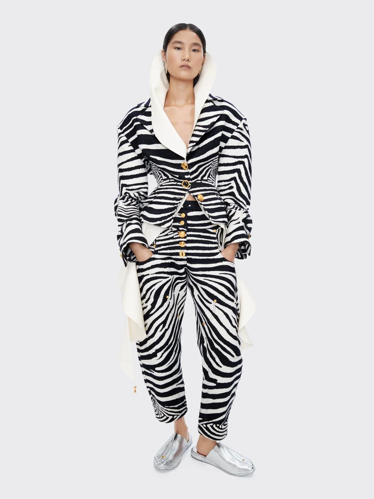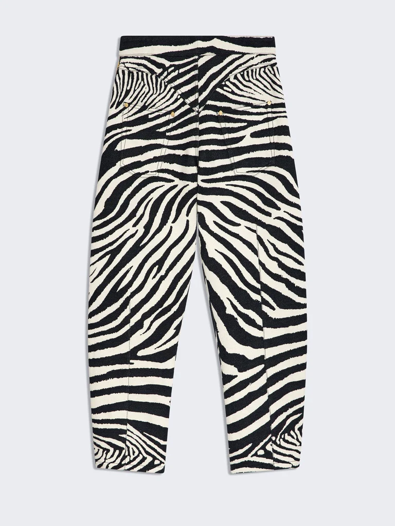 Classique de la Maison, ce pantalon de cowboy à taille basse est réalisé en jacquard zébré écru et noir. Il est rehaussé de nombreux détails emblématiques du denim Schiaparelli, tels que des patchs ton sur ton appliqués sur le devant, des supriqûres, des boutons denim, des zips sur les côtés et des boutons bijoux en laiton doré martelé.