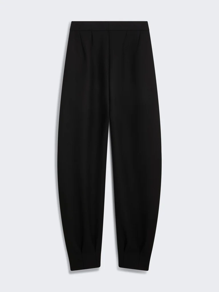 Ce pantalon de cowboy à taille haute en crêpe de laine noire est doté d’un volume large aux cuisses et resserré aux chevilles et de poches à l’italienne.