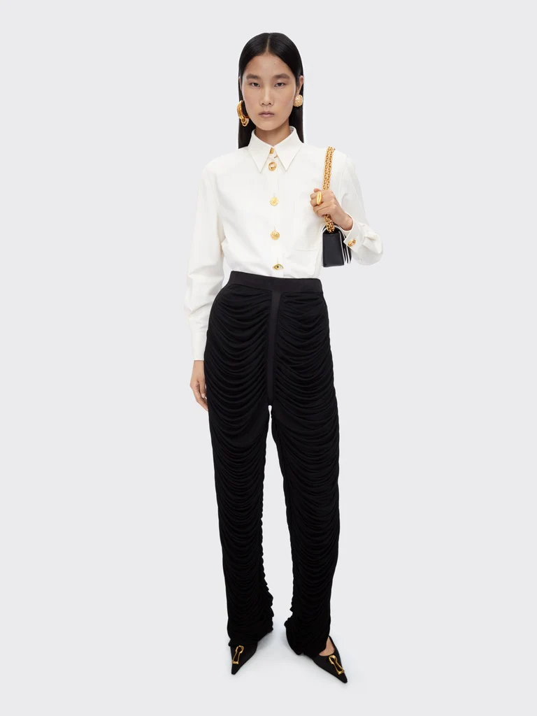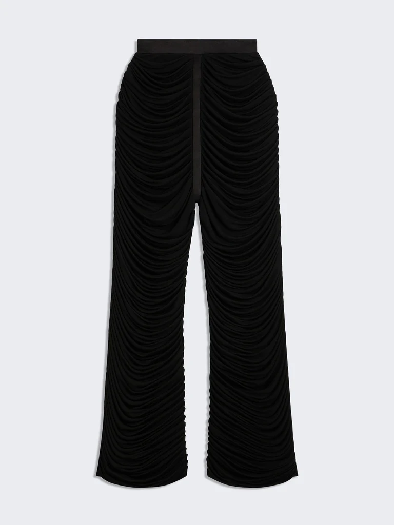 Ce pantalon en jersey noir ultra strech est maintenu à la fourche, puis en plis tombant tout le long de la jambe.