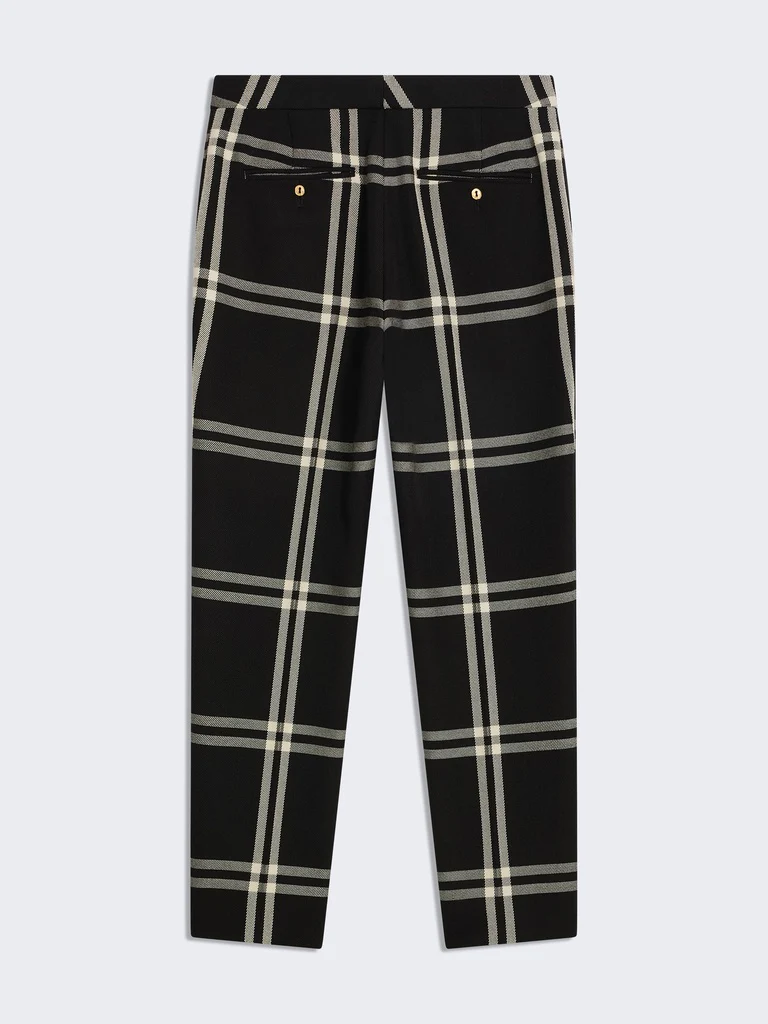 Ce pantalon cigarette à la coupe cintrée est confectionné dans un sergé de laine noir à carreaux écrus.