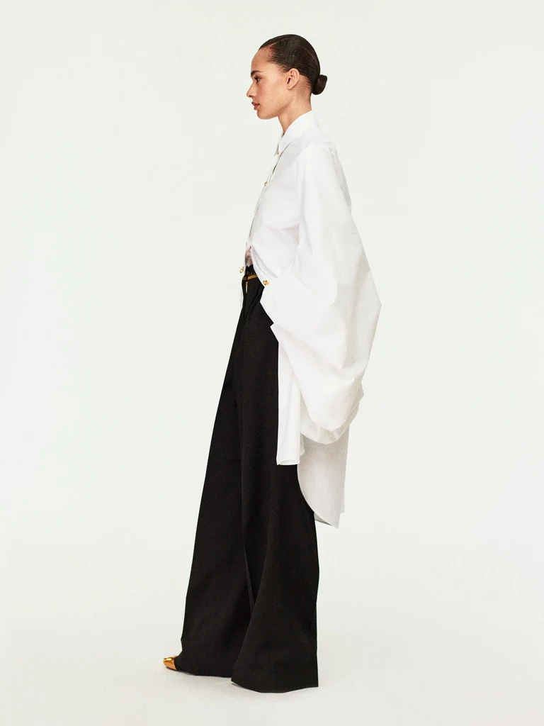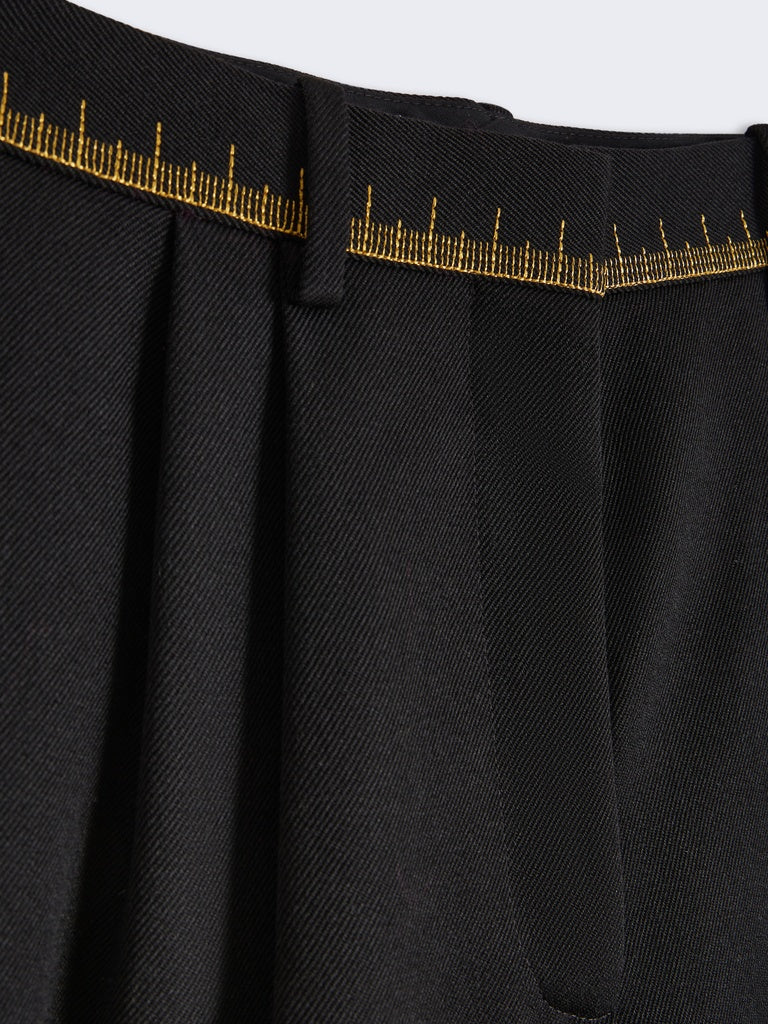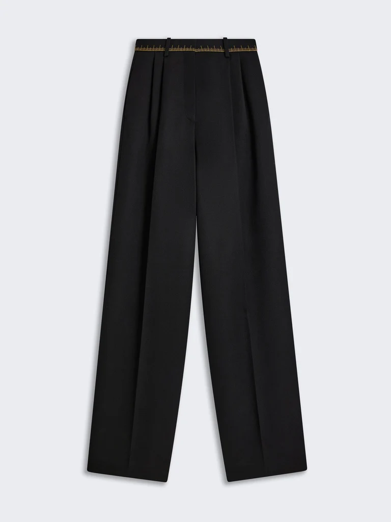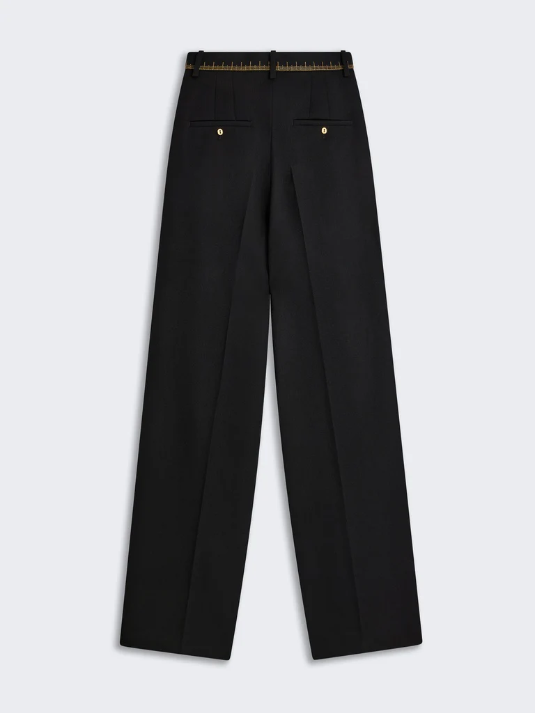 Les poches passepoilées à l’arrière sont fermées par un bouton en laiton doré martelé en forme de cadenas.