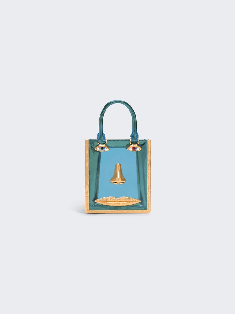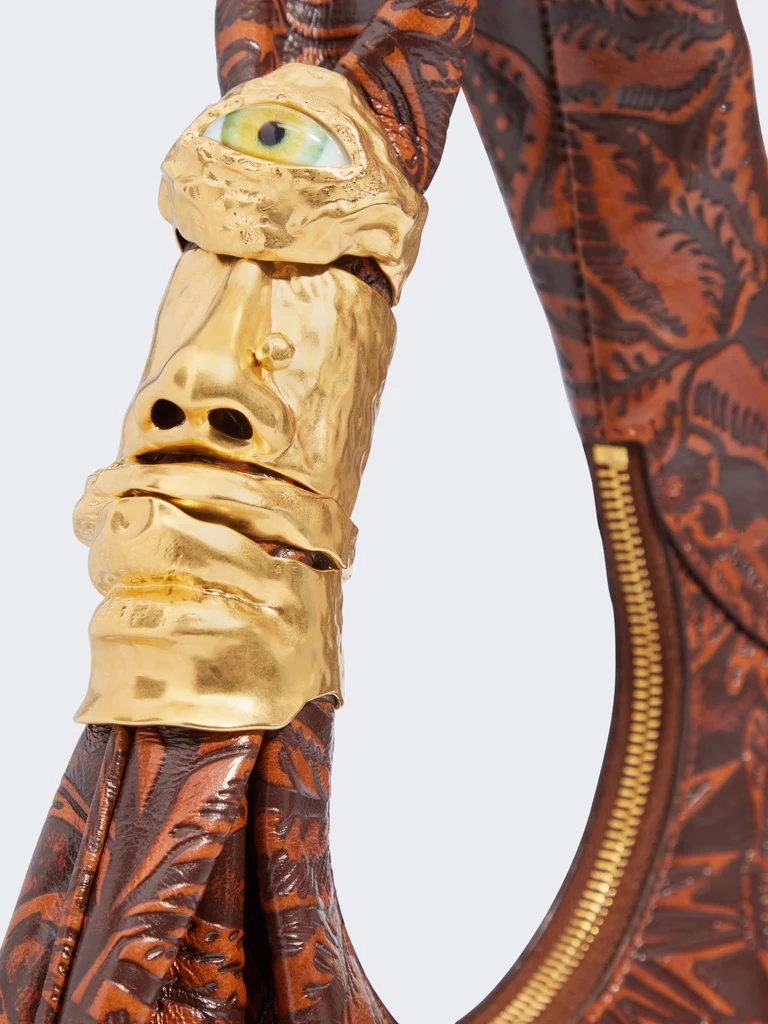 Le petit sac Soufflé est confectionné en cuir de veau marron embossé de codes emblématiques de la Maison. Il est rehaussé de bijoux Anatomie signature en laiton doré martelé formant un visage sur l’anse.