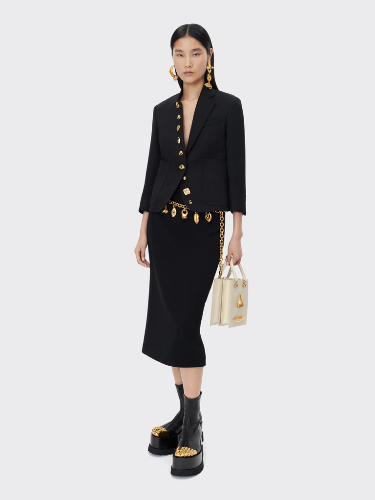 Cette veste à col asymétrique est réalisée en laine noir profond. Sa coupe ajustée se ceint d’un bouton Œil surréaliste doré sous un revers cranté qui se porte rabattu d’un côté. Elle présente une classique poche passepoilée sur la poitrine ainsi que deux grandes poches plaquées, des boutons bijoux signature illuminant les contours du col […]
