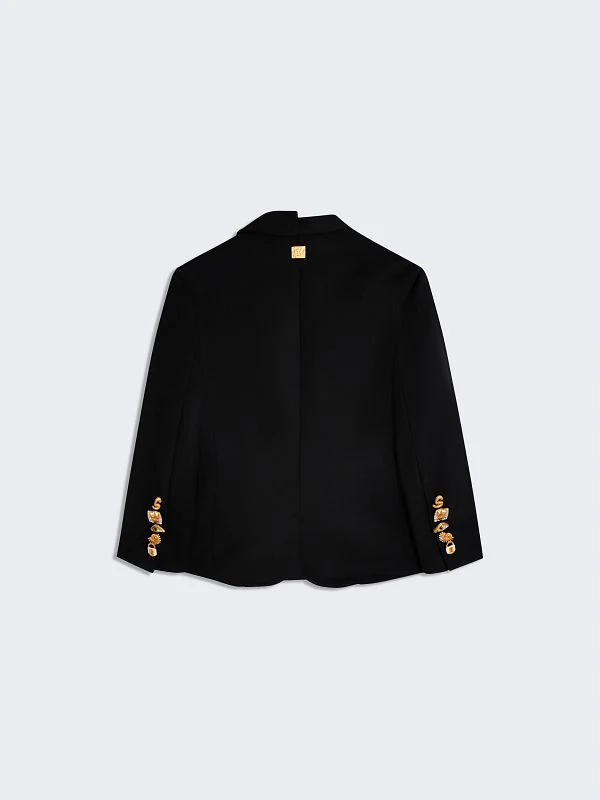 Elle présente une classique poche passepoilée sur la poitrine ainsi que deux grandes poches plaquées, des boutons bijoux signature illuminant les contours du col et des manches fendues.