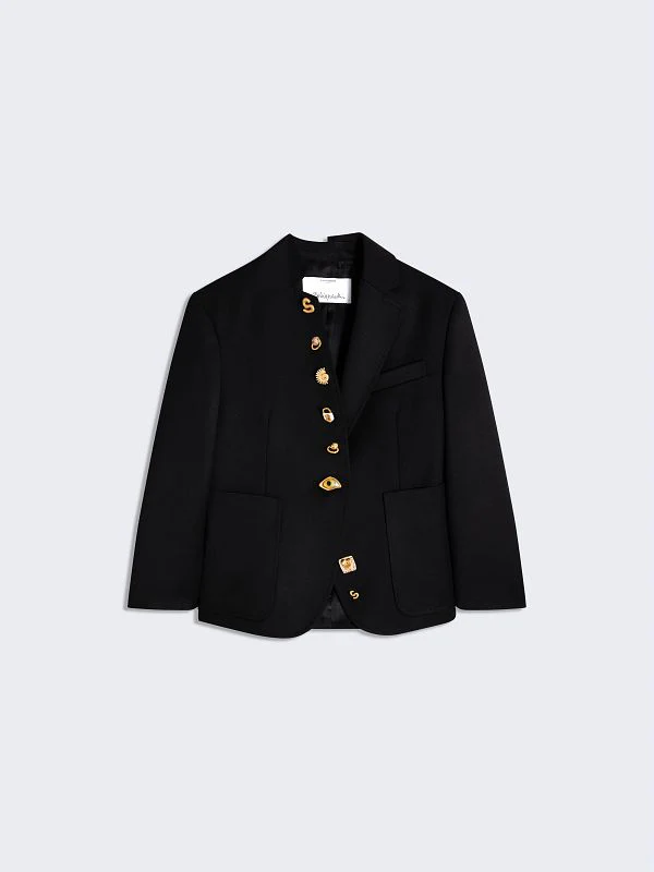 Sa coupe ajustée se ceint d’un bouton Œil surréaliste doré sous un revers cranté qui se porte rabattu d’un côté.
