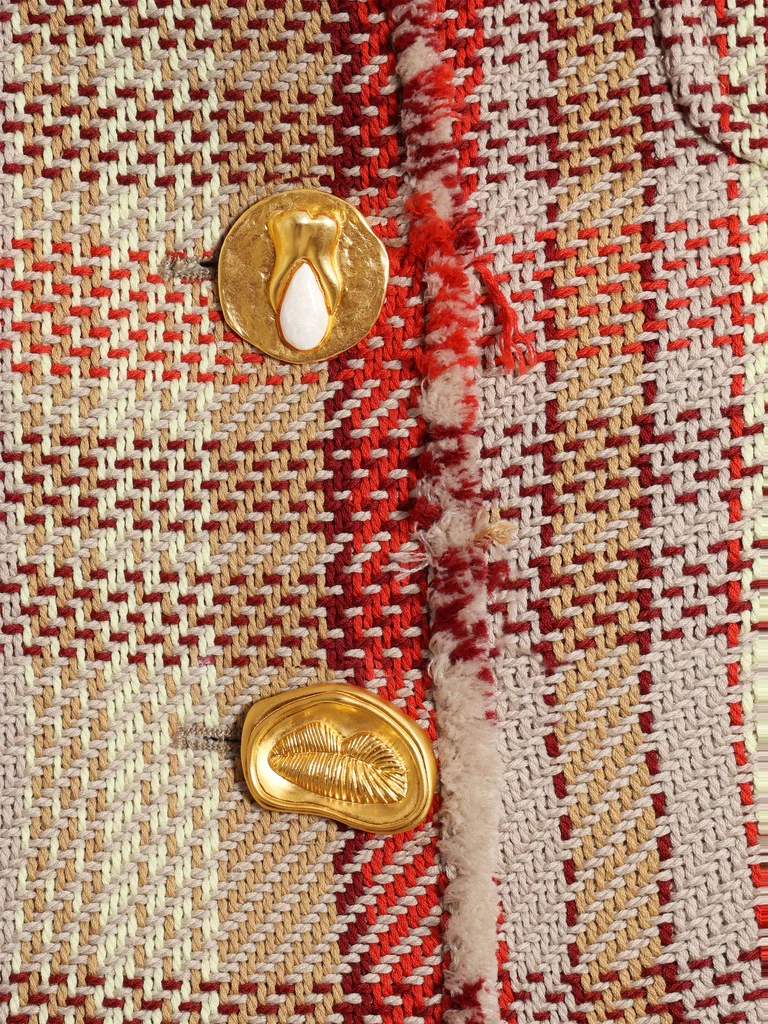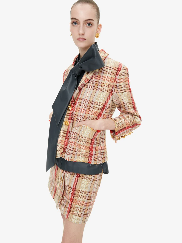 Cette veste à col asymétrique est réalisée en tweed à carreaux rouges, écrus, beiges, gris et blancs.