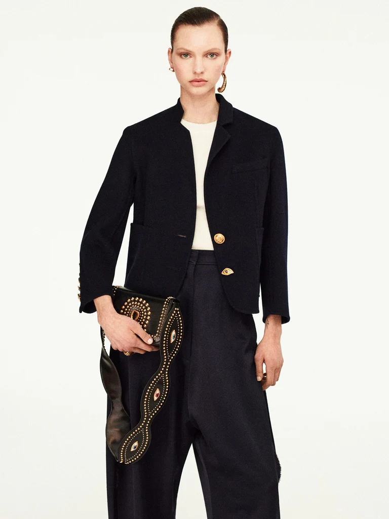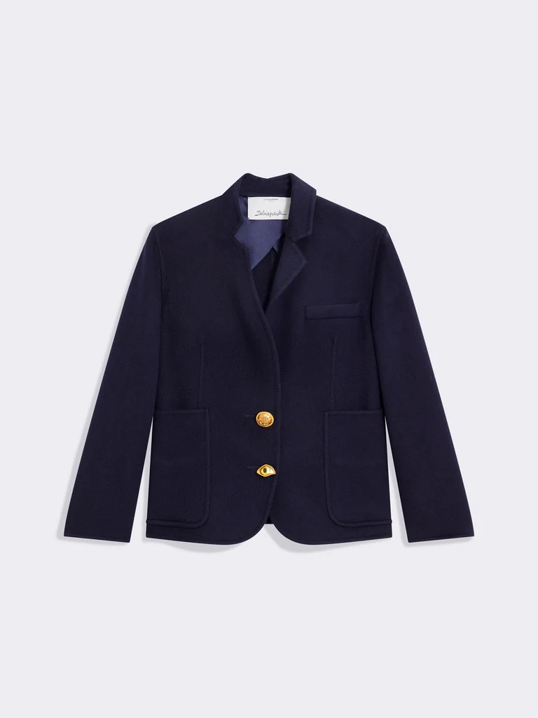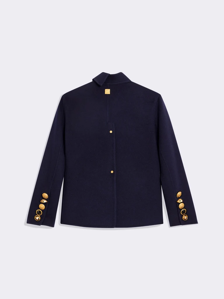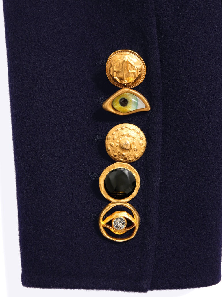 Cette veste à col asymétrique est réalisée en cachemire double face bleu marine. Sa coupe ajustée se ceint d’un bouton Œil surréaliste doré sous un revers cranté qui se porte rabattu d’un côté. Elle présente une classique poche passepoilée sur la poitrine ainsi que deux grandes poches plaquées, des boutons bijoux dorés illuminant les contours du col et des manches fendues