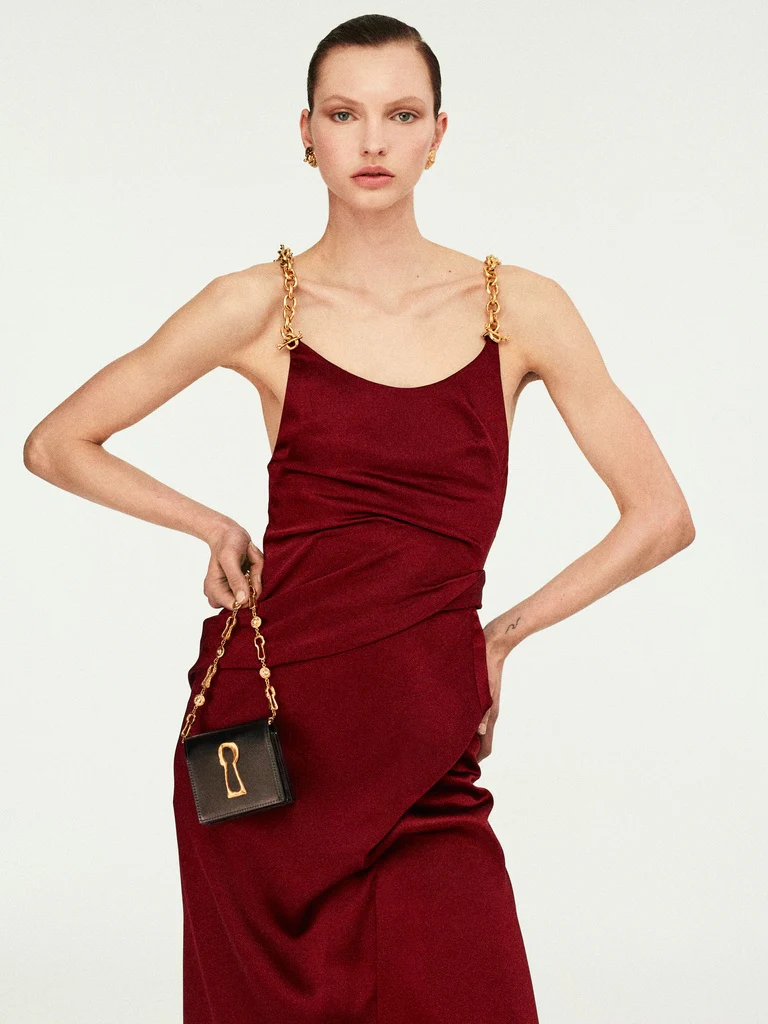 L’une d’elle comporte un piercing en métal argenté et le logo signature Schiaparelli est gravé au dos de chaque boucle.
