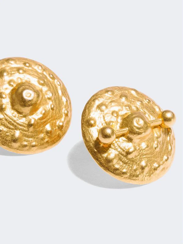 Petite paire de boucles d’oreilles pour oreilles percées de forme Tétons en laiton doré martelé.