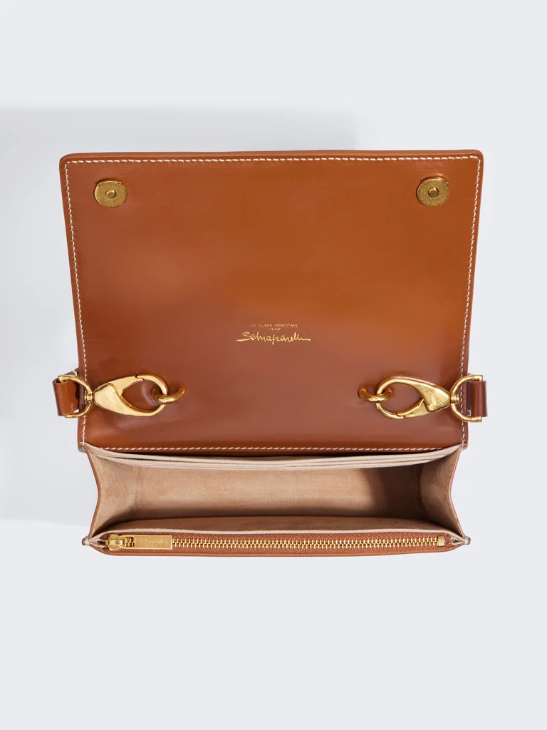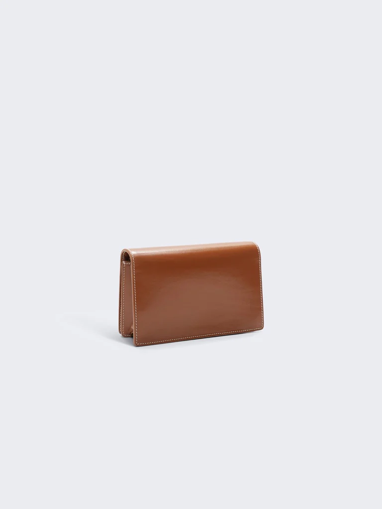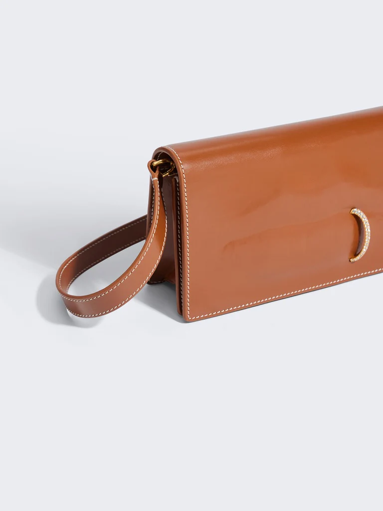 Cette pochette en cuir végétal marron est incrustée d’une Bouche moulée réhaussée d’un piercing à strass et d’une chaîne en métal doré.