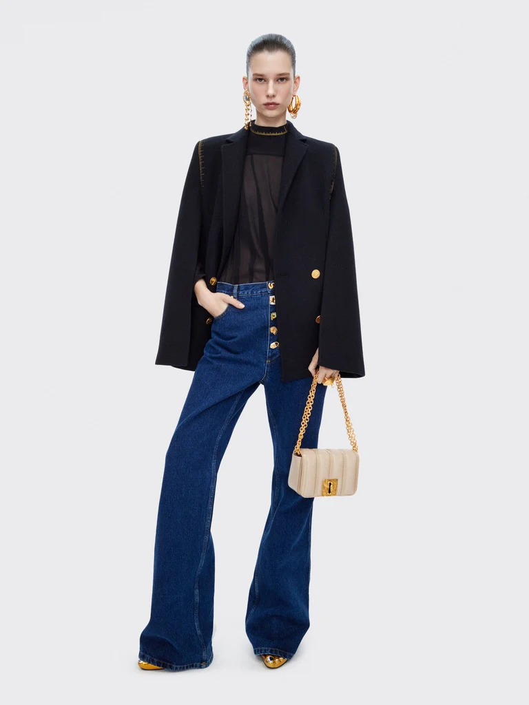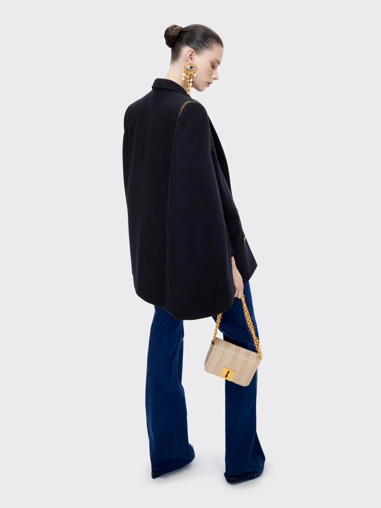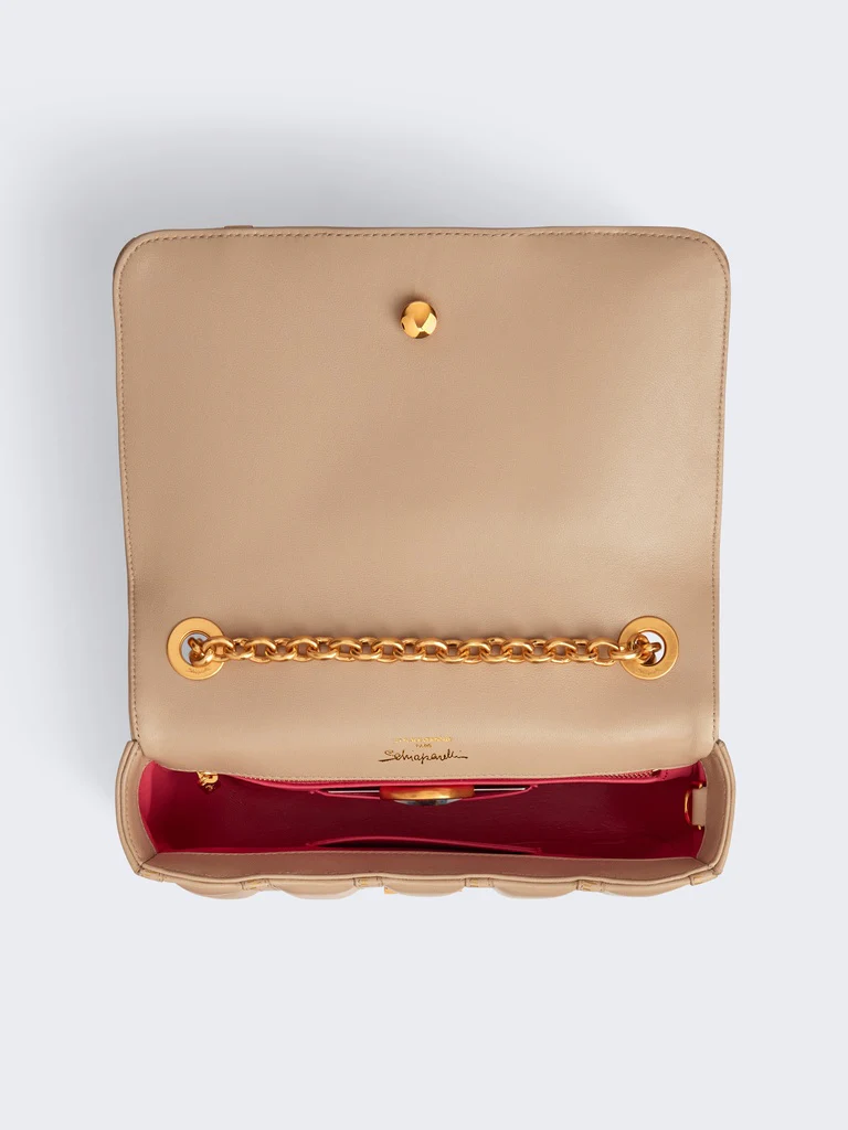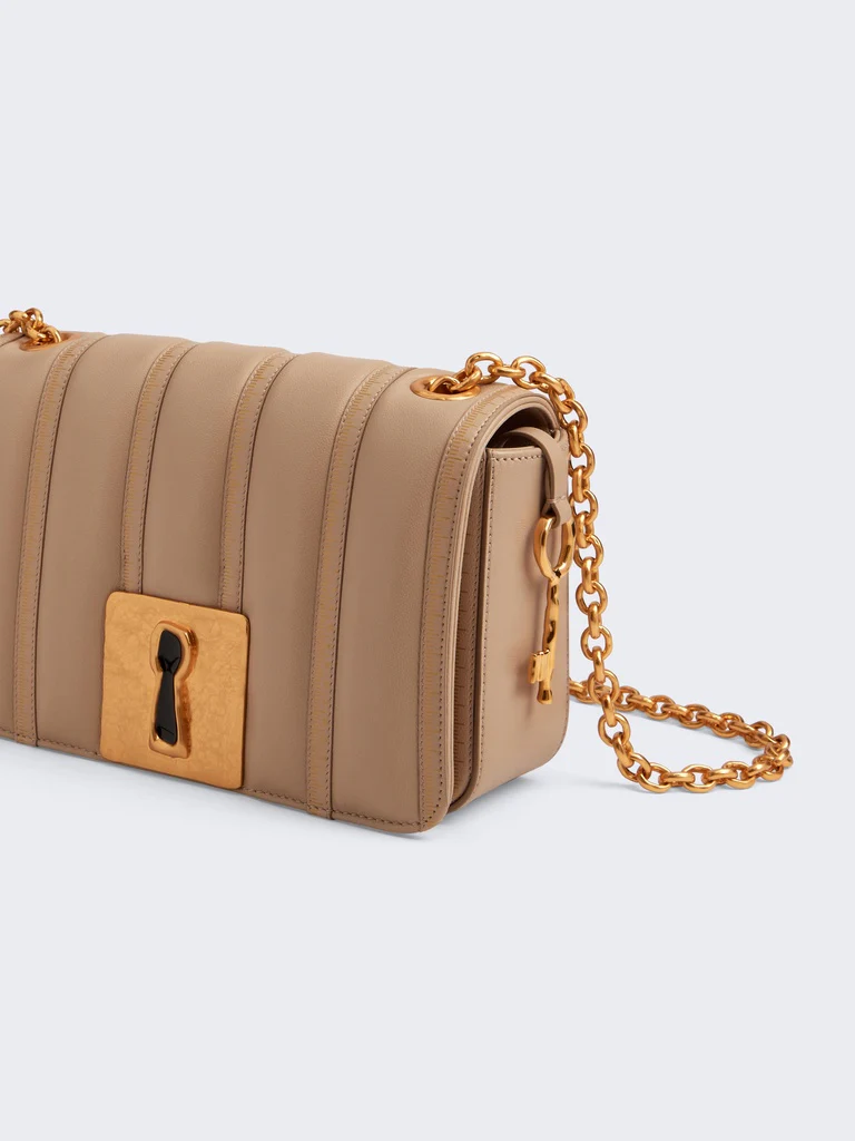 Ce petit sac Schiap est confectionné dans un cuir trapunto écru ton sur ton embossé du motif Mètre Ruban signature et orné d’une plaque Trou de Serrure signature, d’une chaîne à maillons et d’un bijou Clé en laiton doré sur le côté.