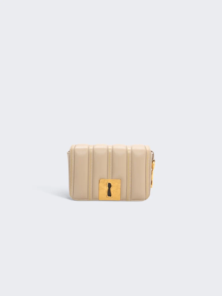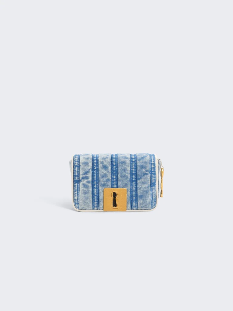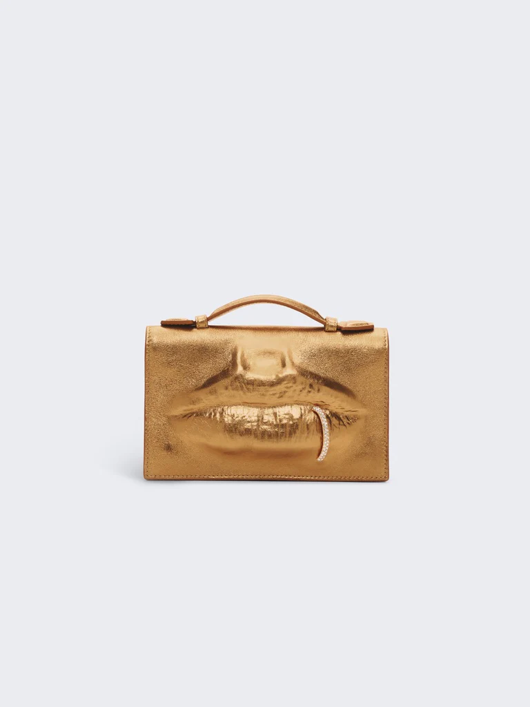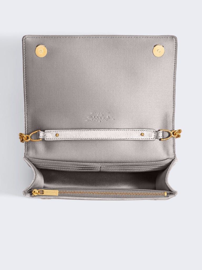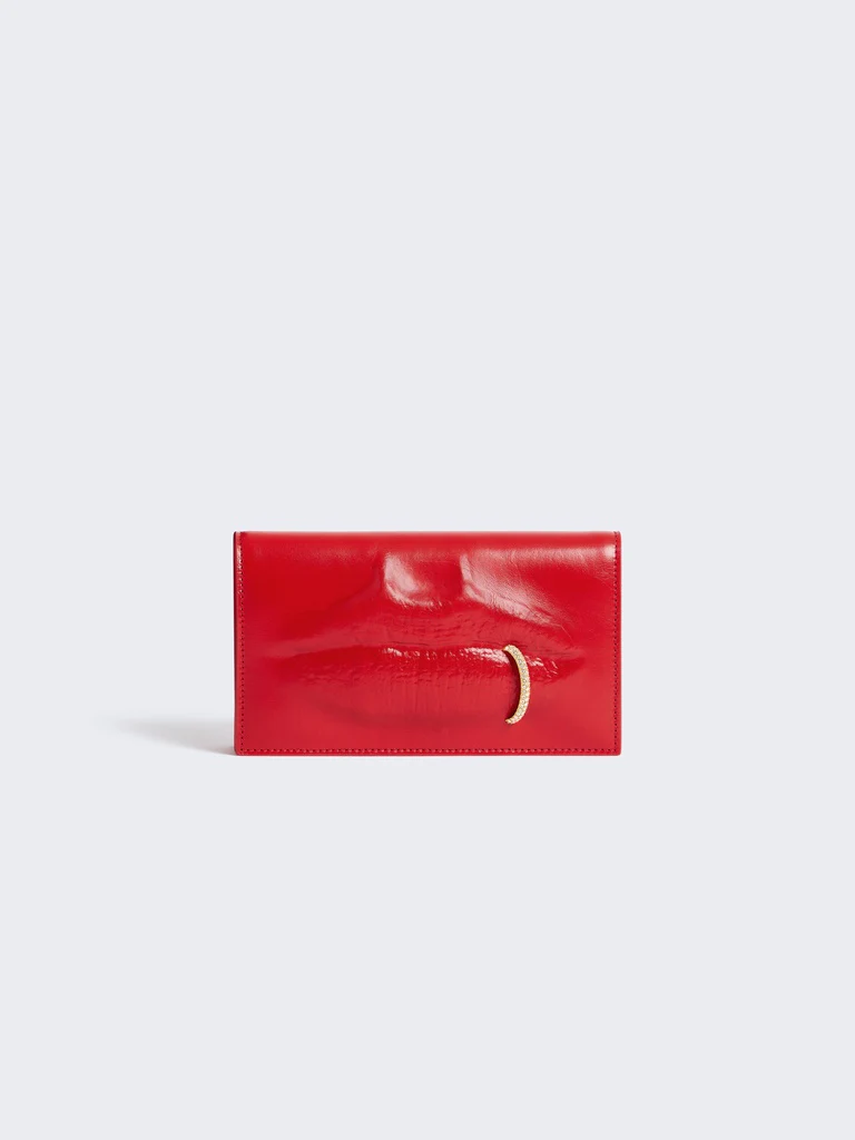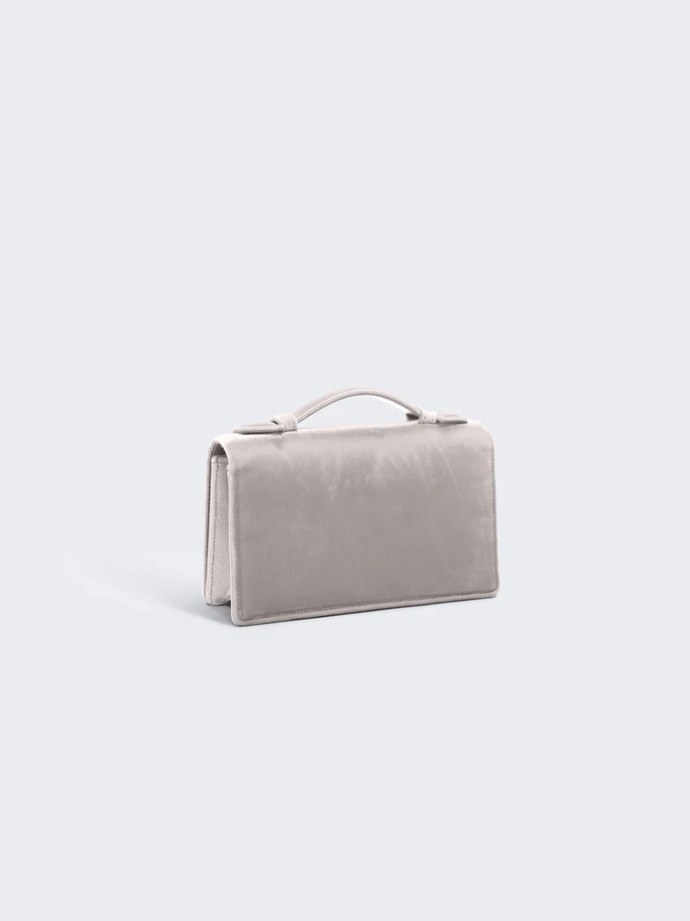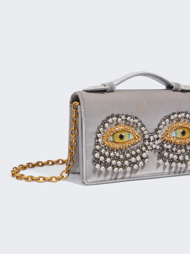 Cette pochette en velours technique est rehaussée de Yeux bijoux signature en perles et strass rend hommage à l’un des codes phares de la Maison.