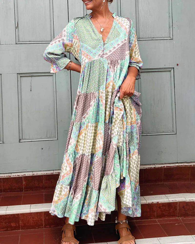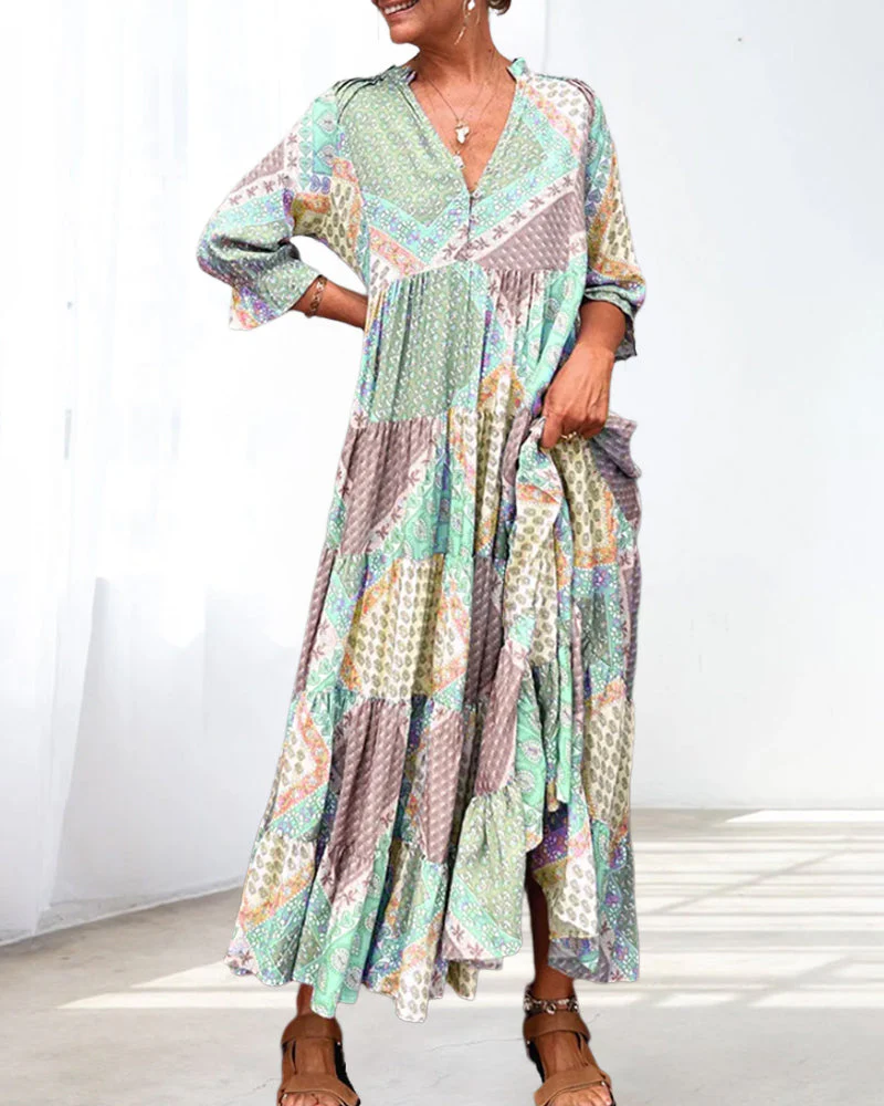 Cette robe ligne A maxi séduit par son imprimé coloré en bloc de couleurs et ses manches 3/4 élégantes. Sa coupe ample et froncée assure un confort optimal tout en mettant en valeur votre silhouette avec un décolleté en V féminin. Parfaite pour le quotidien au printemps, été ou automne, elle allie style et aisance pour toutes vos sorties.