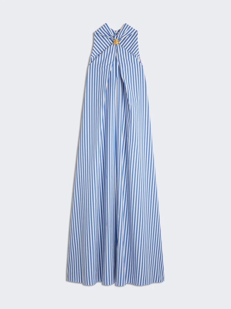 Cette robe longue sans manches à la coupe de nus est confectionnée en sergé de laine gris avec un jeu de rubans cousus puis relâchés à partir des hanches qui crée un mouvement de la robe.