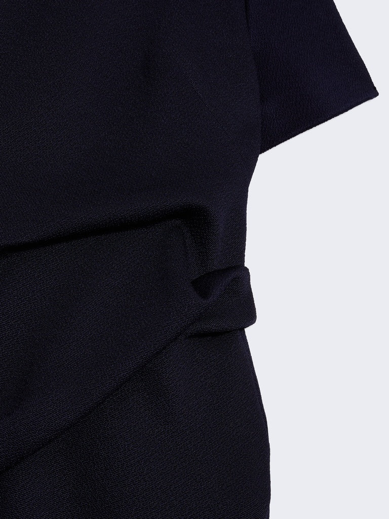 Cette robe twistée en jersey bleu marine à la coupe inspirée d’un tee-shirt descend jusqu’aux pieds. Elle est réhaussée d’un détail piercing au niveau de la hanche et d’un zip invisible au milieu dos.