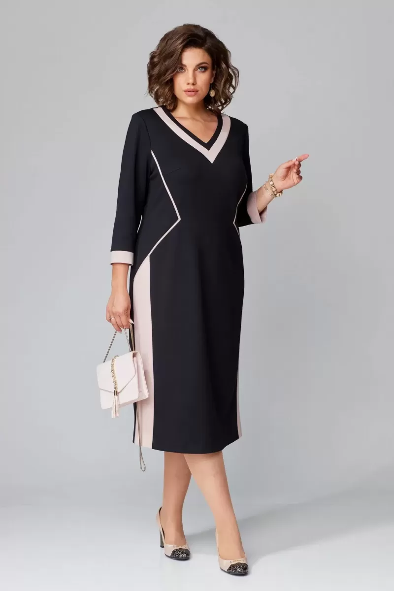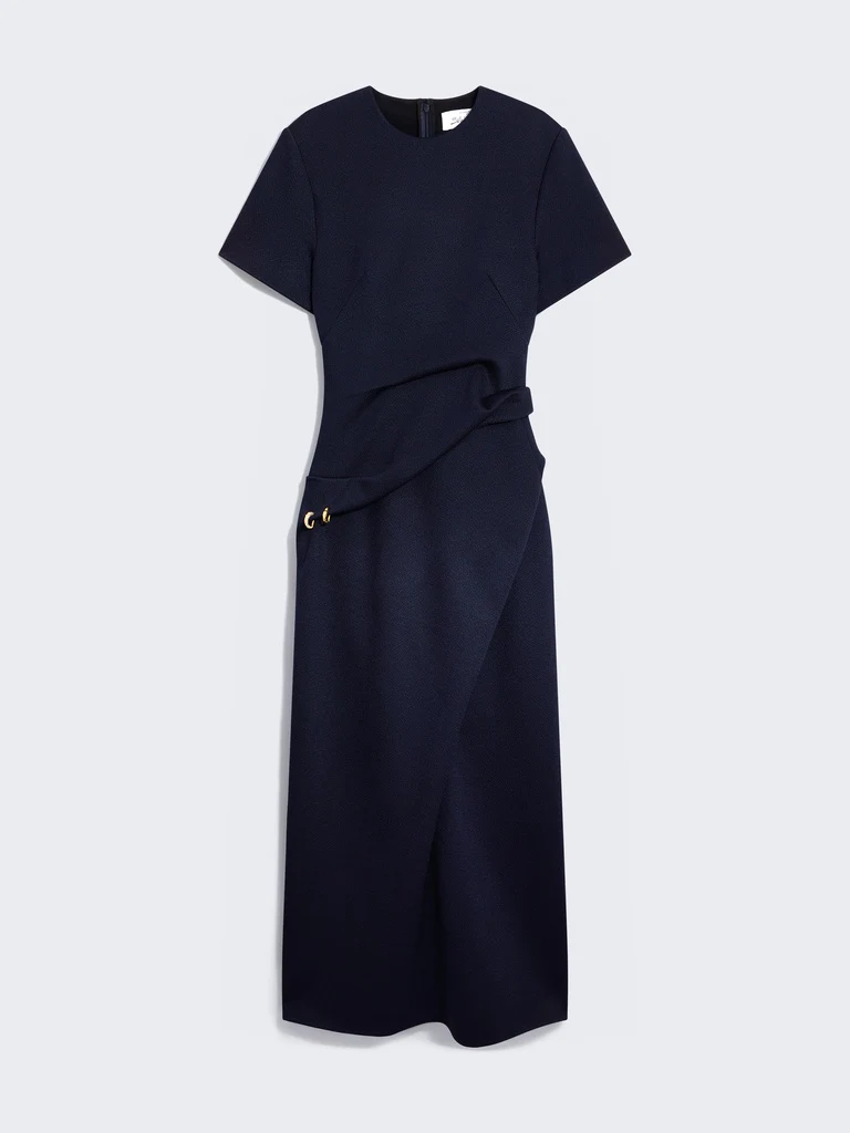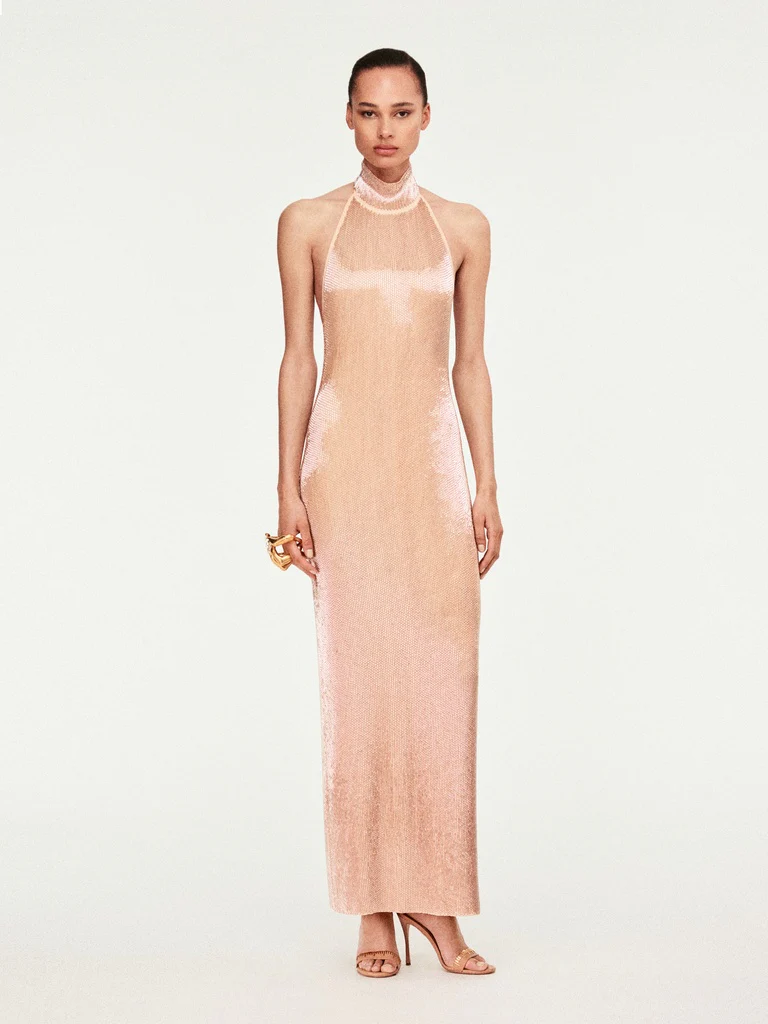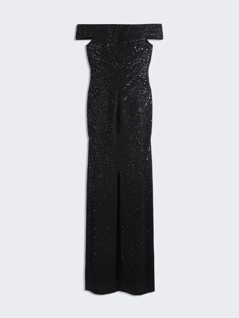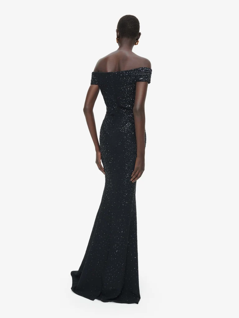 Sa coupe près du corps aux épaules dénudées et à l’encolure droite galbe la silhouette.